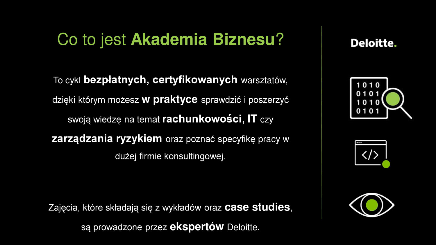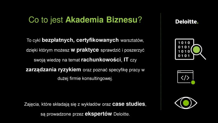 Zajęcia, które składają się z wykładów oraz case studies, są prowadzone przez ekspertów Deloitte.