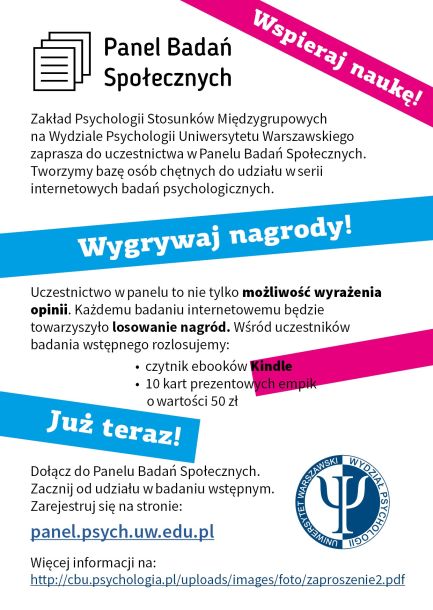 Aby dołączyć do Panelu Badań Społecznych, wystarczy zarejestrować się na stronie (klikając w link https://panel.psych.uw.edu.pl) i wziąć udział w badaniu wstępnym. Każdej internetowej ankiecie będzie towarzyszyło losowanie nagród. Wśród uczestników badania wstępnego zostaną rozlosowane czytnik e-booków Kindle oraz 10 kart prezentowych empik o wartości 50 zł.