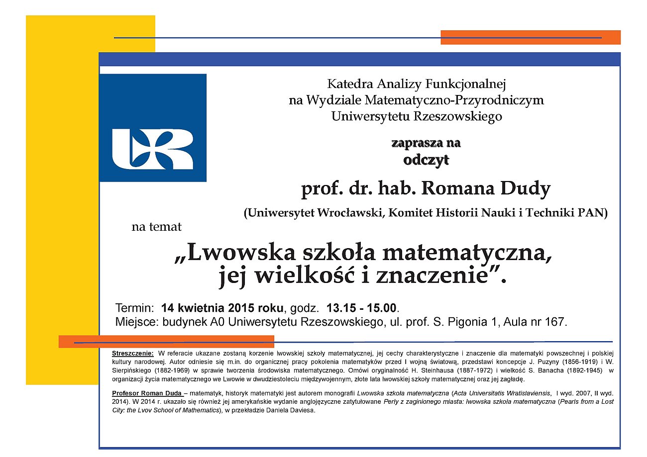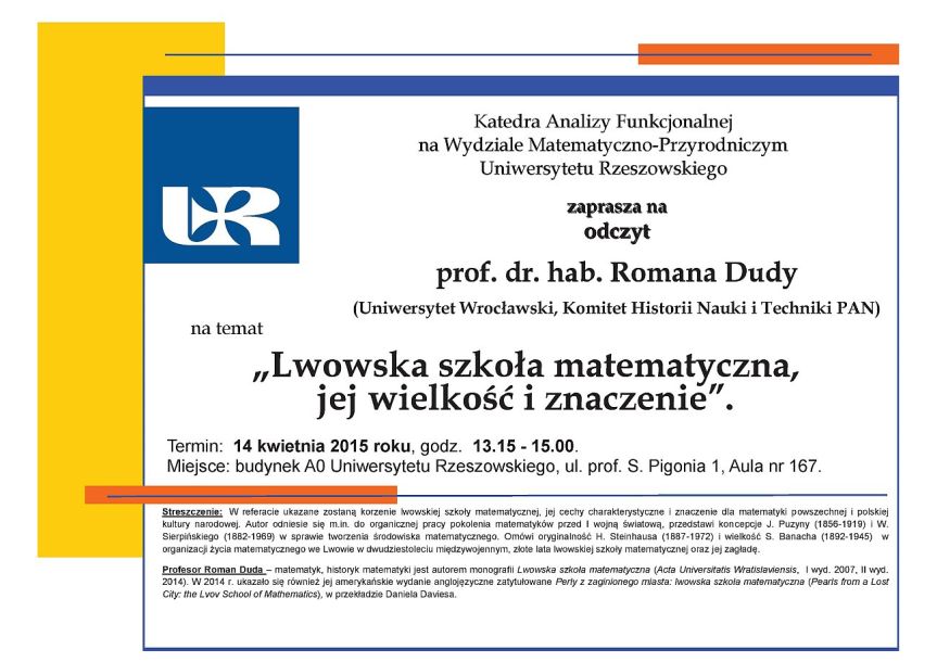 Zapraszamy na odczyt prof. dra hab. Romana Dudy pt. Lwowska Szkoła Matematyczna, jej wielkość i znaczenie.