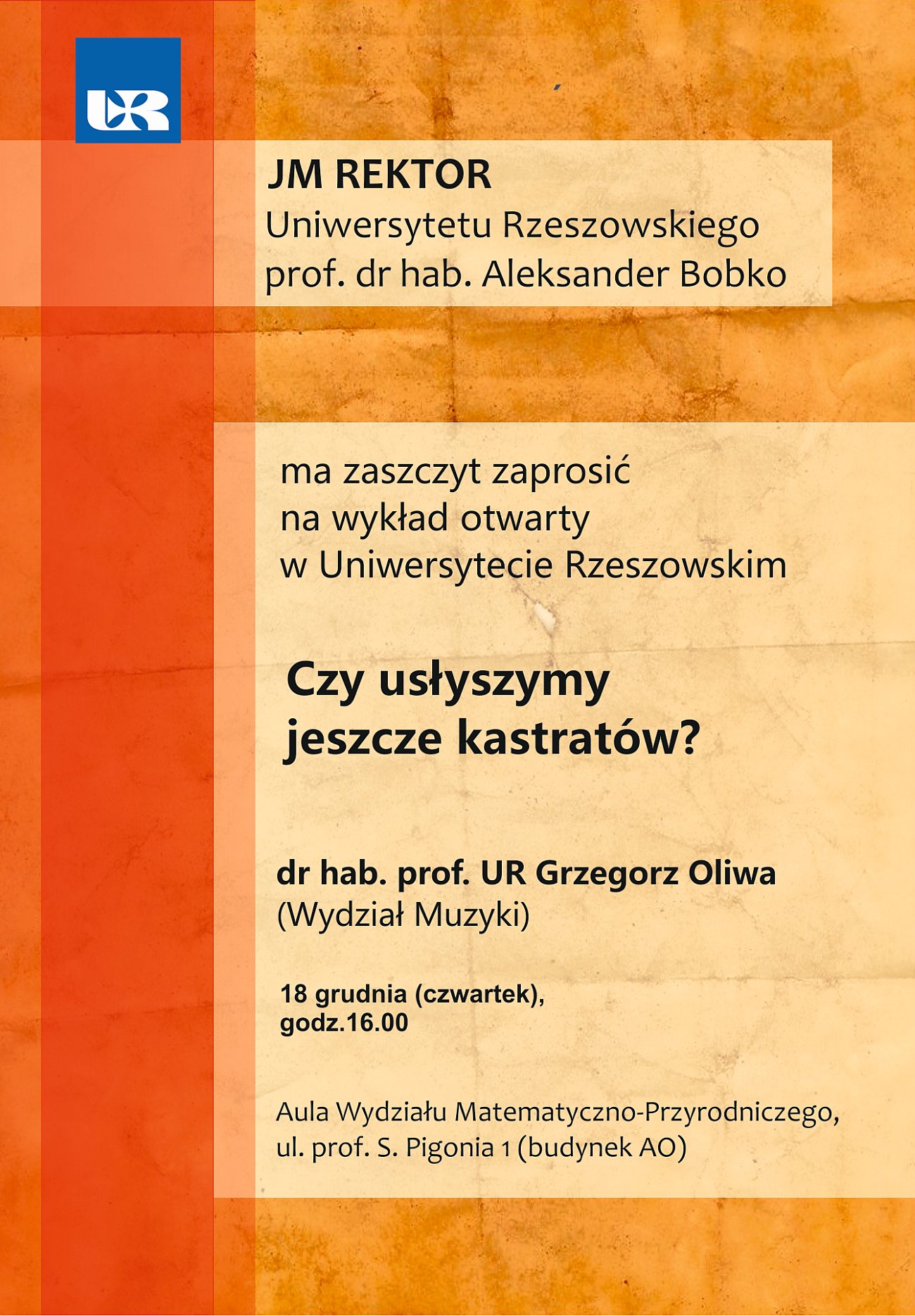 W dniu 18.12.2014 r. zapraszamy na kolejne spotkanie z cyklu wykładów otwartych. Wykład poprowadzi dr hab. prof UR Grzegorz Oliwa z Wydziału Muzyki pt. „Czy usłyszymy jeszcze kastratów”