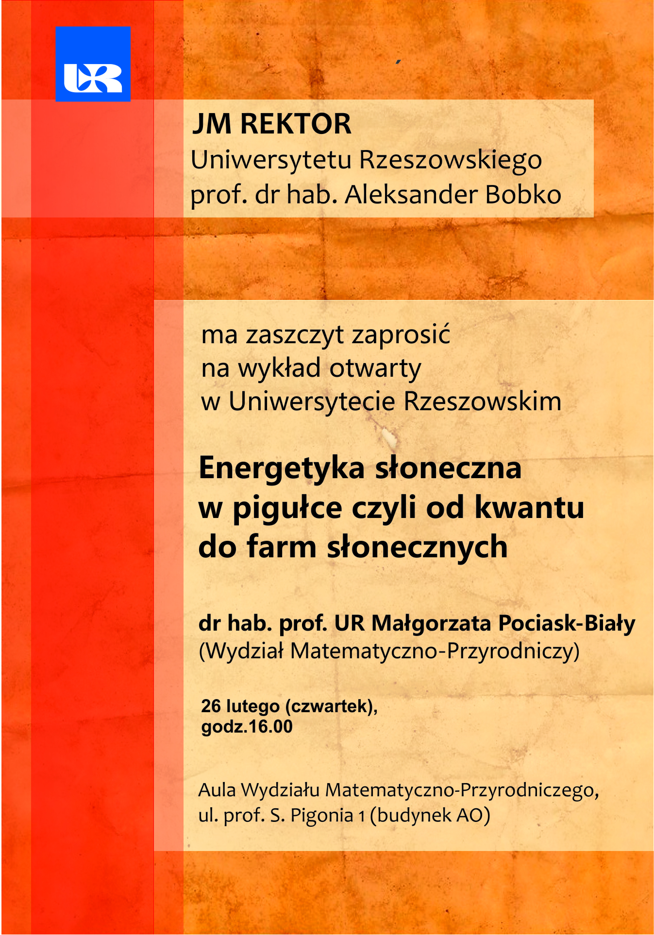 W dniu 26.02.2015 r. zapraszamy na kolejne spotkanie z cyklu wykładów otwartych. Wykład poprowadzi dr hab. prof. UR Małgorzata Pociask-Biały z Wydziału Matematyczno-Przyrodniczego pt. „Energetyka słoneczna w pigułce czyli od kwantu do farm słonecznych”.