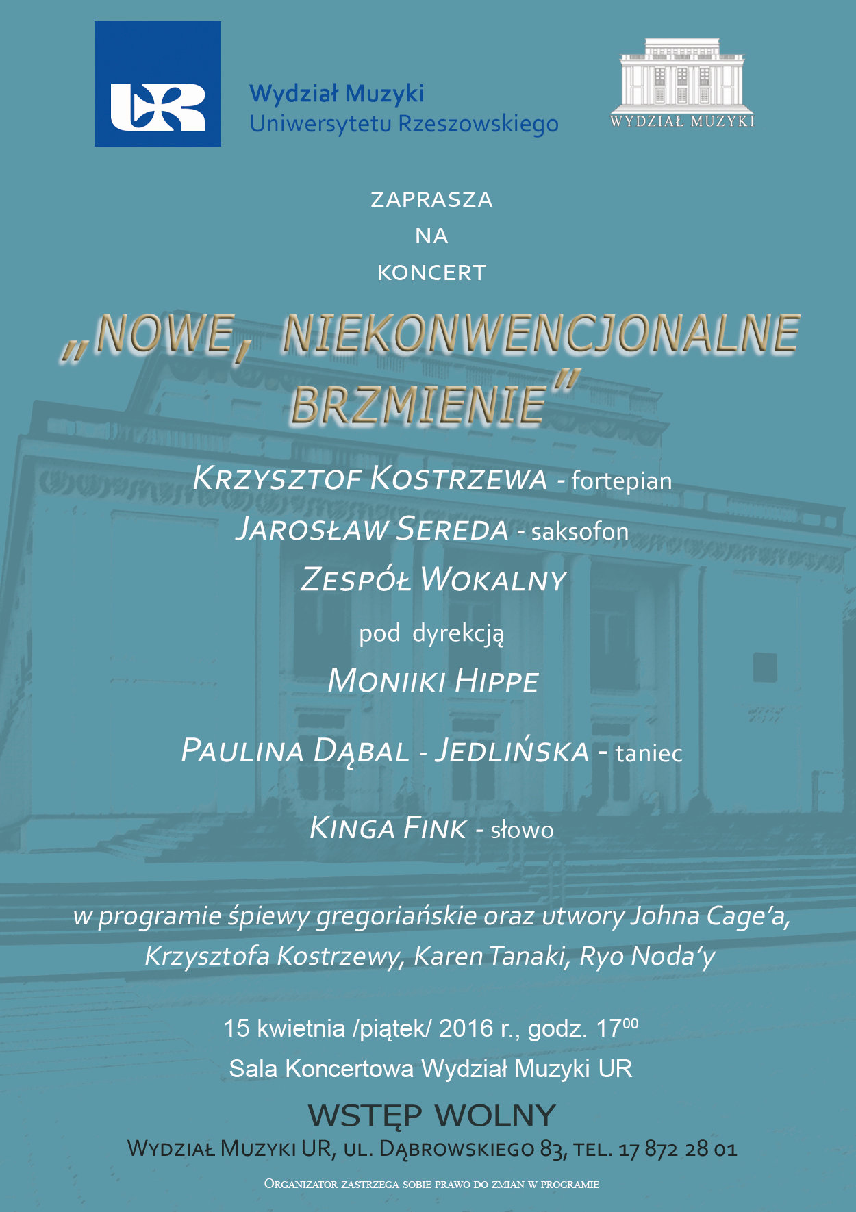 Koncert odbędzie się15 kwietnia (piątek) 2016 r., o godz. 17.00 w Sali Koncertowej Wydziału Muzyki UR.