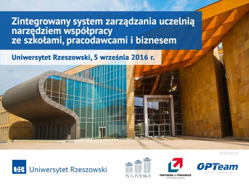 Celem konferencji zaplanowanej na 5 września 2016 r. w Rzeszowie jest prezentacja efektów trwającej kilka lat modernizacji narzędzi i procedur zarządczych obowiązujących w Uniwersytecie Rzeszowskim. Dzięki wspólnym wysiłkom kadry administracyjnej i dydaktycznej Uniwersytetu Rzeszowskiego oraz partnerów biznesowych uczelni: Public Consulting Group, Partners in Progress i OPTeam, w Rzeszowie opracowano model budowania długotrwałej i zaangażowanej relacji pomiędzy Uczelnią a studentami – od momentu identyfikacji najlepszych możliwych kandydatów na studia i udzielenia im wsparcia w procesie kształcenia po skuteczne wprowadzenie ich na rynek pracy.