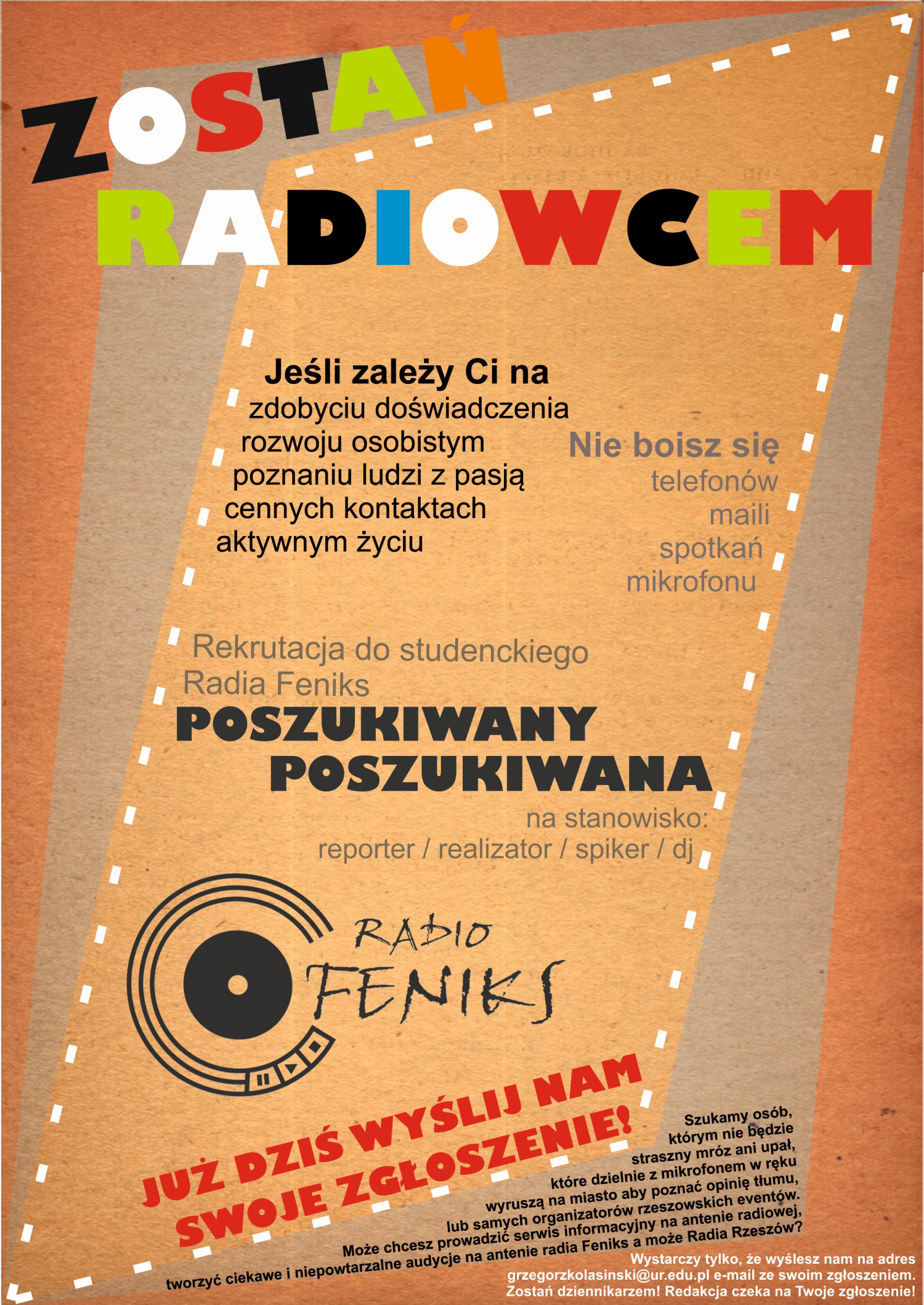 Wystarczy tylko, że wyślesz nam na adres grzegorzkolasinski@ur.edu.pl swoje zgłoszenie. Radio „Feniks” czeka właśnie na Ciebie! Skontaktujemy się z Tobą i zaprosimy na spotkanie.