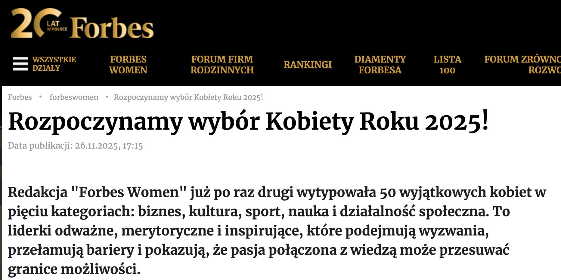 Redakcja Forbes Women przypomina, że w bieżącym roku lek. Agnieszka Kaczmarska-Such jako jedyna osoba z Europy otrzymała w Paryżu prestiżowy grant firmy La Roche-Posay w wysokości 120 tysięcy euro. Grant ten przyznawany jest wybitnym naukowcom prowadzącym innowacyjne badania w obszarze dermatologii i nauk pokrewnych.