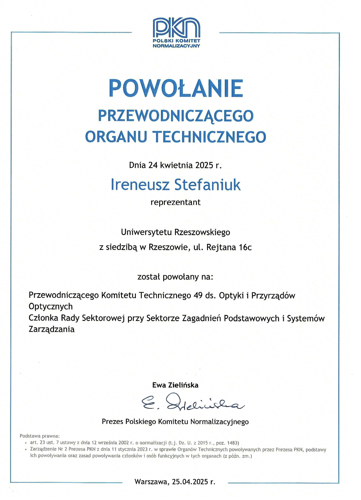 Polski Komitet Normalizacyjny powołał dra hab. Ireneusza Stefaniuka, prof. UR na Przewodniczącego Organu Technicznego ds. Optyki i Przyrządów Optycznych