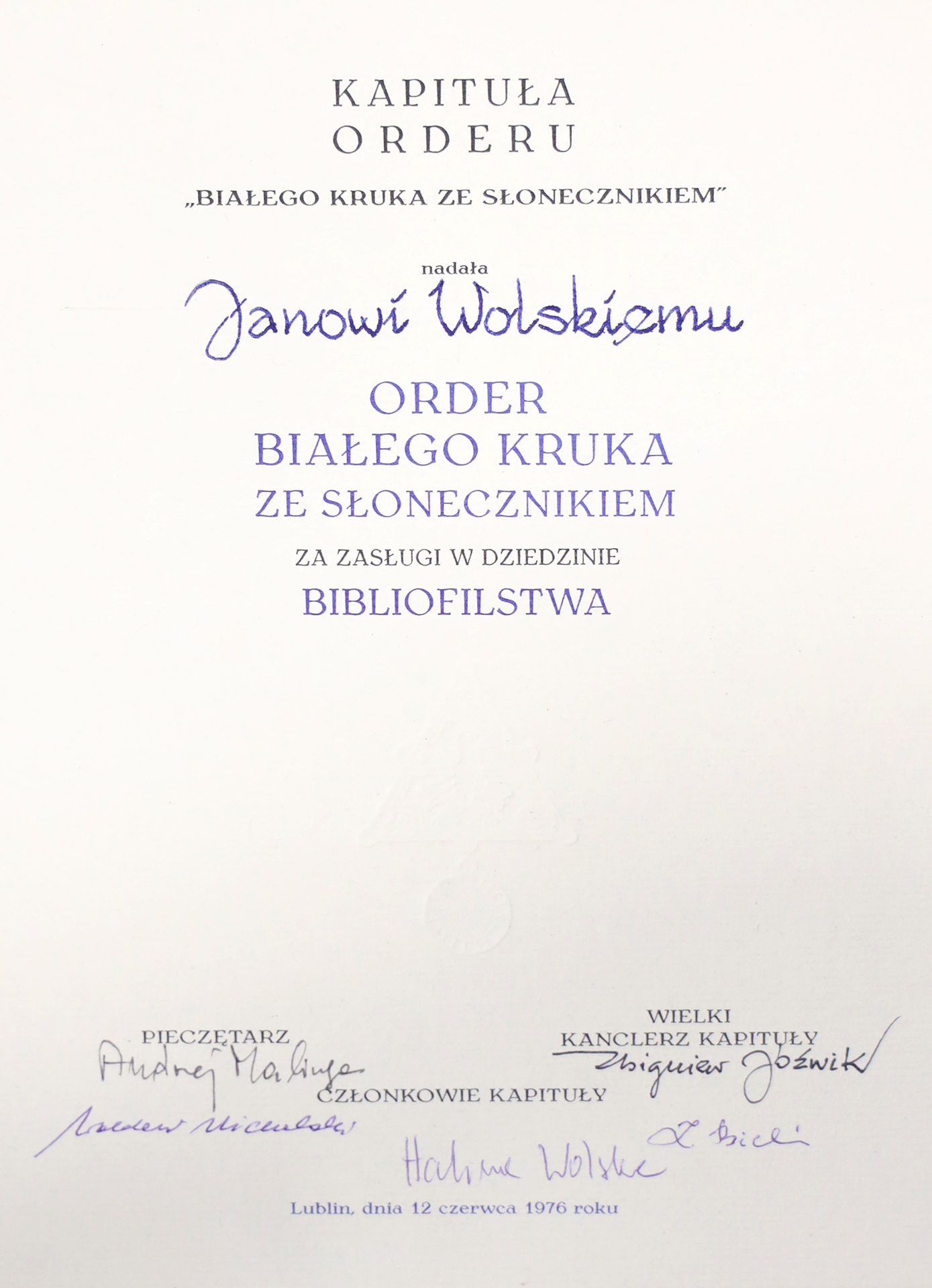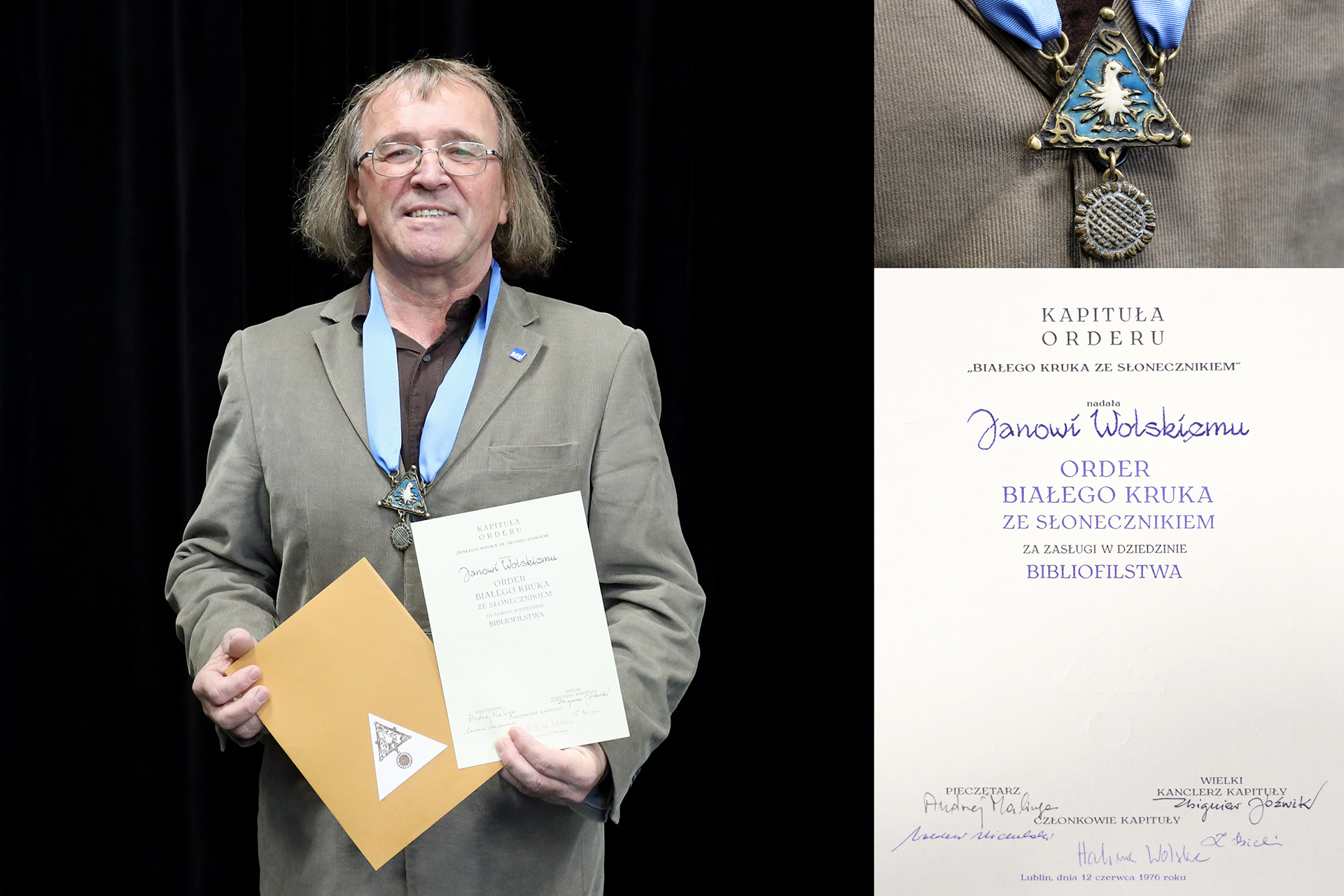 Prof. Jan Wolski został przyjęty w poczet Dam i Kawalerów mogących poszczycić się tym pięknym, cennym i wyjątkowo bliskim sercu każdego bibliofila odznaczeniem, do grona, które członkinie i członków, niezależnie od wieku i wykonywanego zawodu, łączy jedna pasja: umiłowanie książki w jej rozlicznych formach, postaciach, obszarach i skalach oddziaływania. Wiedzą oni, że czas poświęcony księgom, nie jest czasem zmarnowanym, bo książka służy nauce, działalności społecznej, jest namiętnością indywidualną i ma także wymiar artystyczny.