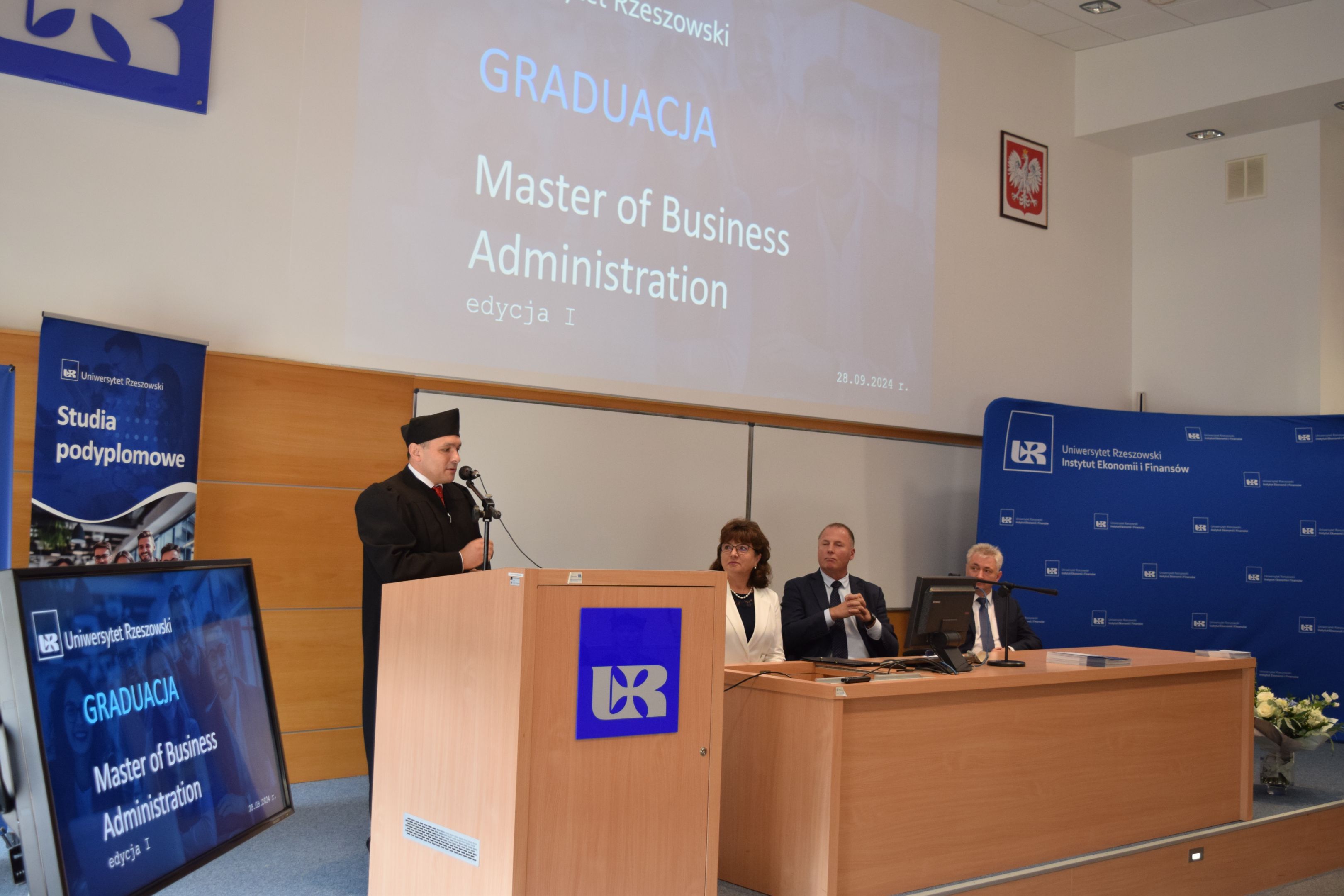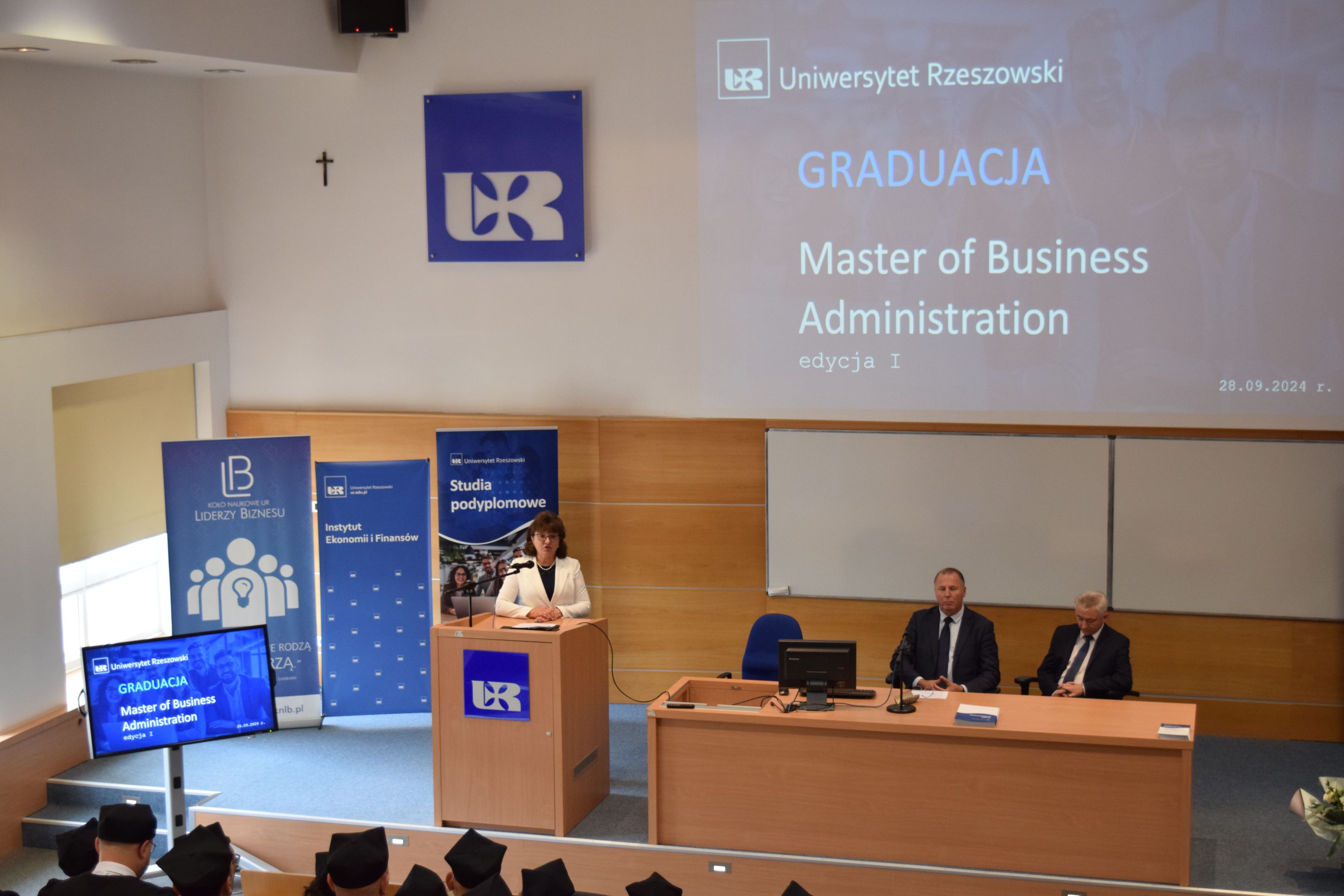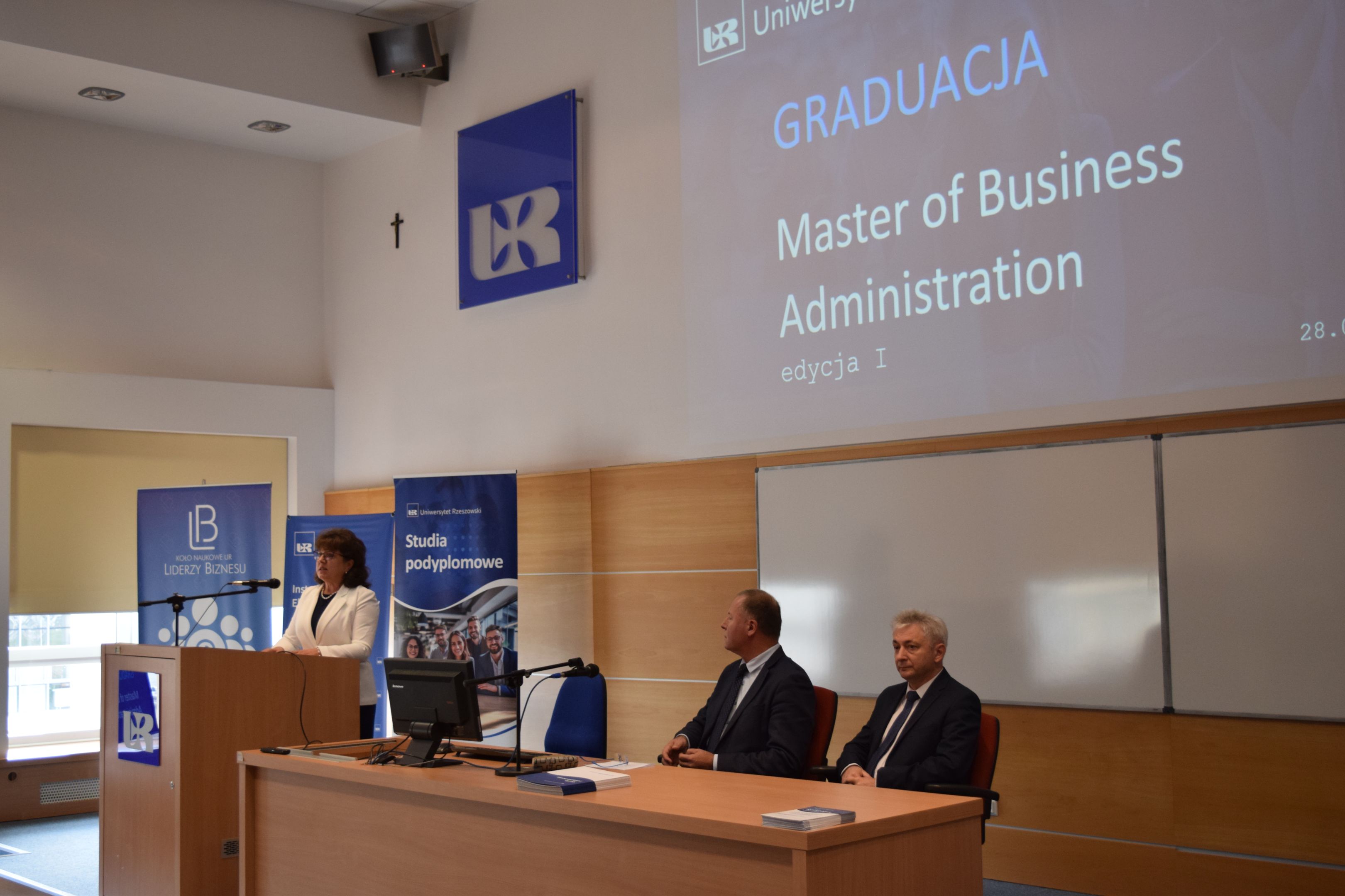 Ceremonia rozpoczęła się od przemówienia kierownik studiów dr hab. Marioli Grzebyk, prof. UR, która podkreśliła znaczenie zdobytej wiedzy oraz konieczności stałego podnoszenia kwalifikacji i poszerzania umiejętności we współczesnym dynamicznym świecie biznesu. Następnie głos zabrali przedstawiciele władz uczelni. Dziekan Kolegium Nauk Społecznych dr hab. Bogdan Wierzbiński, prof. UR pogratulował osiągnięć absolwentom i zachęcał ich do wykorzystywania zdobytej wiedzy w praktyce gospodarczej. Z kolei Dyrektor Instytutu Ekonomii i Finansów dr hab. Ryszard Kata, prof. UR gratulując absolwentom ukończenia studiów MBA podkreślił znaczenie zdobytych kwalifikacji menedżerskich i wskazał na potencjał rozwojowy kierunków biznesowych. Złożył absolwentom życzenia aby ta inwestycja w siebie przyniosła wiele satysfakcji osobistych i przyczyniła się do umacniania ich pozycji zawodowej i rozwoju organizacji, którymi kierują.