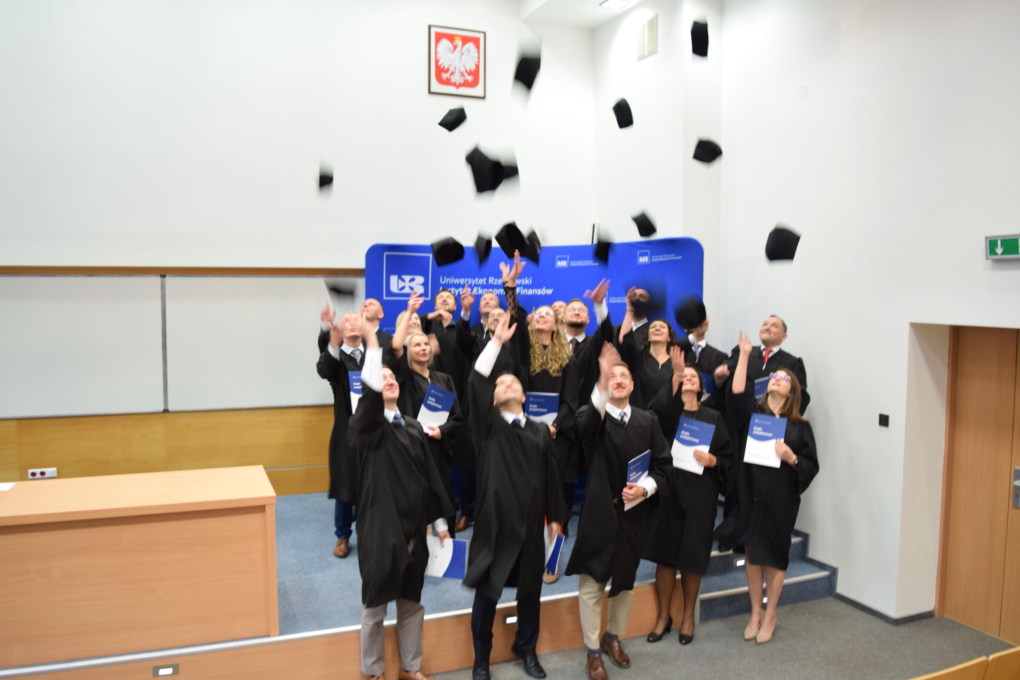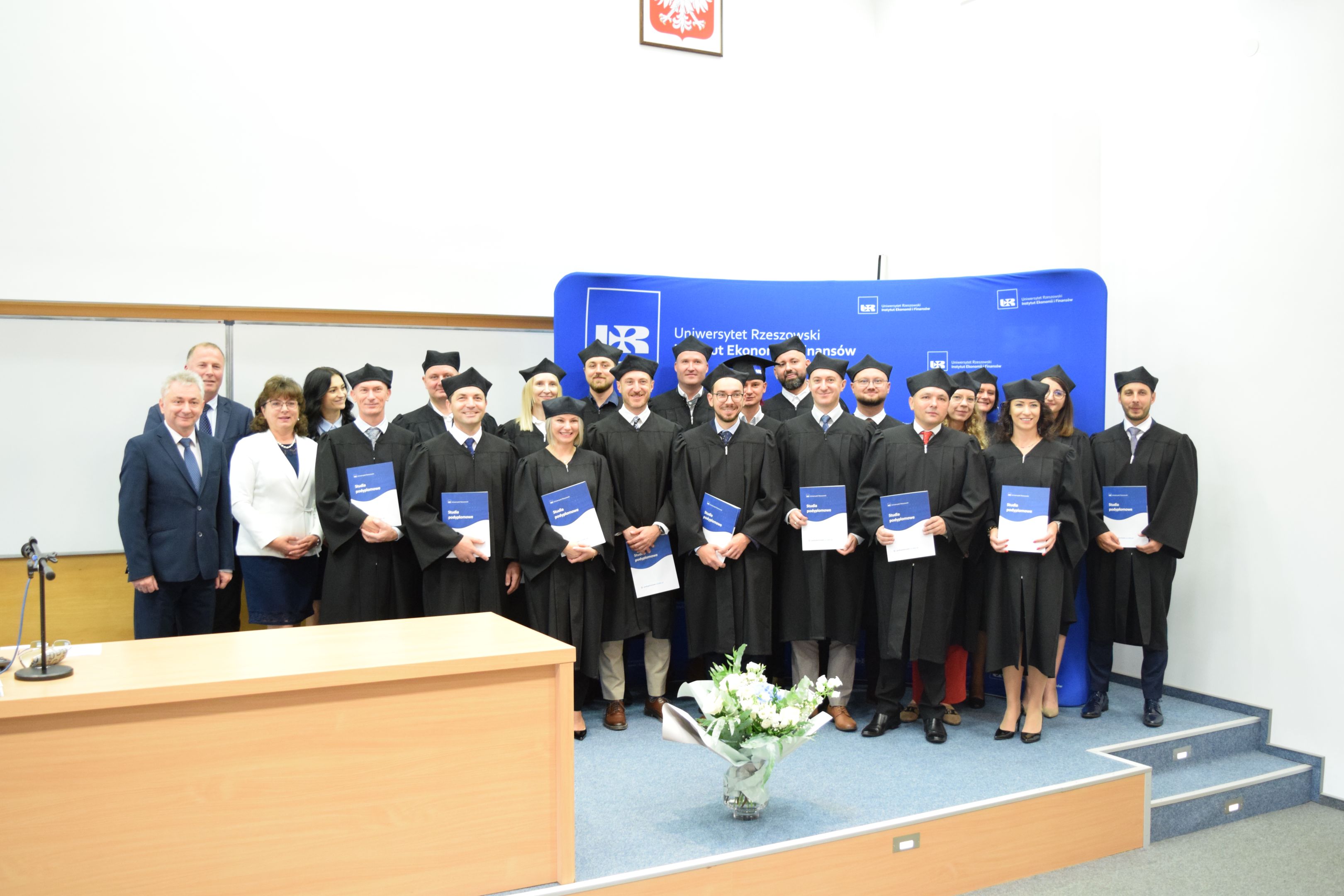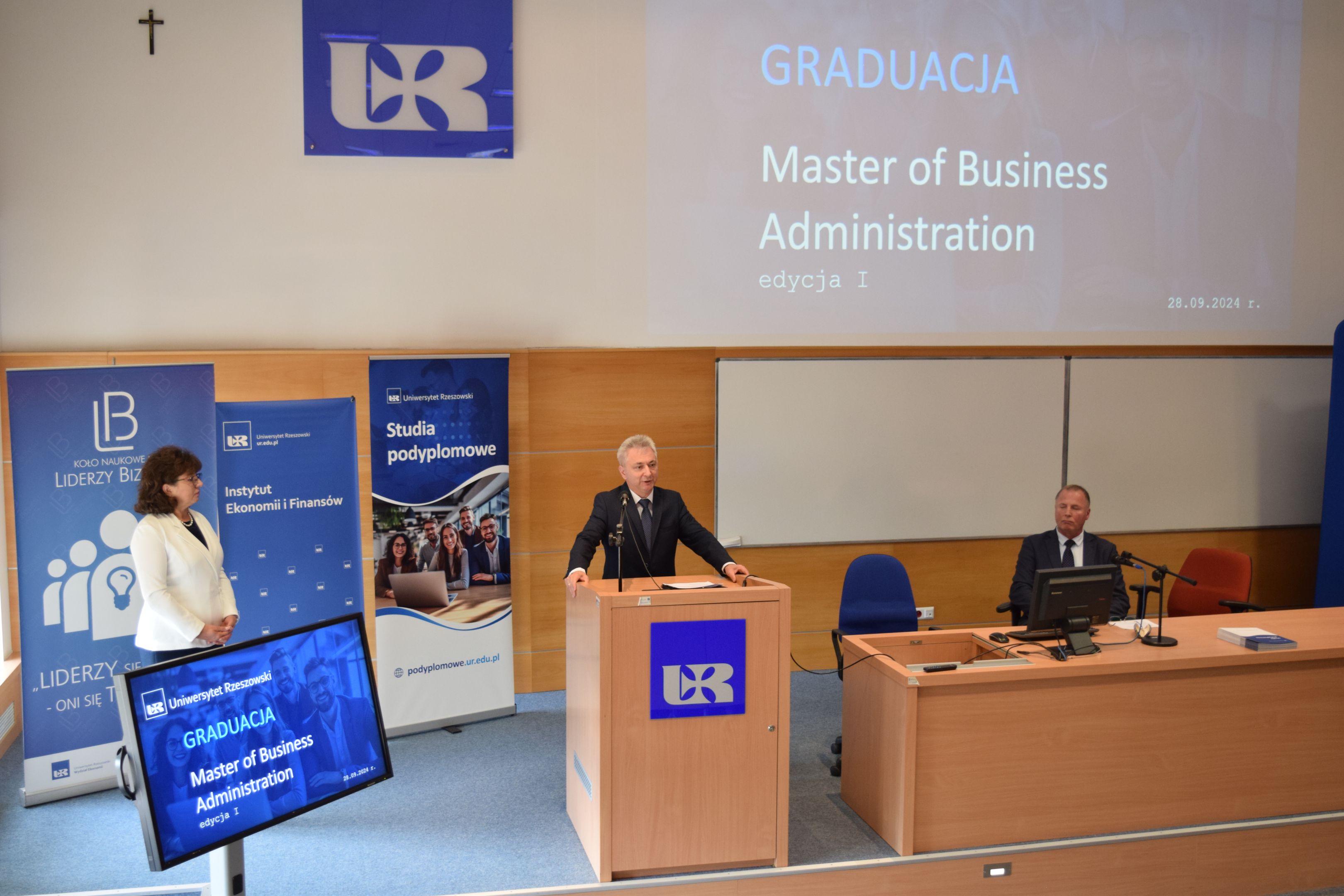 Ceremonia rozpoczęła się od przemówienia kierownik studiów dr hab. Marioli Grzebyk, prof. UR, która podkreśliła znaczenie zdobytej wiedzy oraz konieczności stałego podnoszenia kwalifikacji i poszerzania umiejętności we współczesnym dynamicznym świecie biznesu. Następnie głos zabrali przedstawiciele władz uczelni. Dziekan Kolegium Nauk Społecznych dr hab. Bogdan Wierzbiński, prof. UR pogratulował osiągnięć absolwentom i zachęcał ich do wykorzystywania zdobytej wiedzy w praktyce gospodarczej. Z kolei Dyrektor Instytutu Ekonomii i Finansów dr hab. Ryszard Kata, prof. UR gratulując absolwentom ukończenia studiów MBA podkreślił znaczenie zdobytych kwalifikacji menedżerskich i wskazał na potencjał rozwojowy kierunków biznesowych. Złożył absolwentom życzenia aby ta inwestycja w siebie przyniosła wiele satysfakcji osobistych i przyczyniła się do umacniania ich pozycji zawodowej i rozwoju organizacji, którymi kierują.