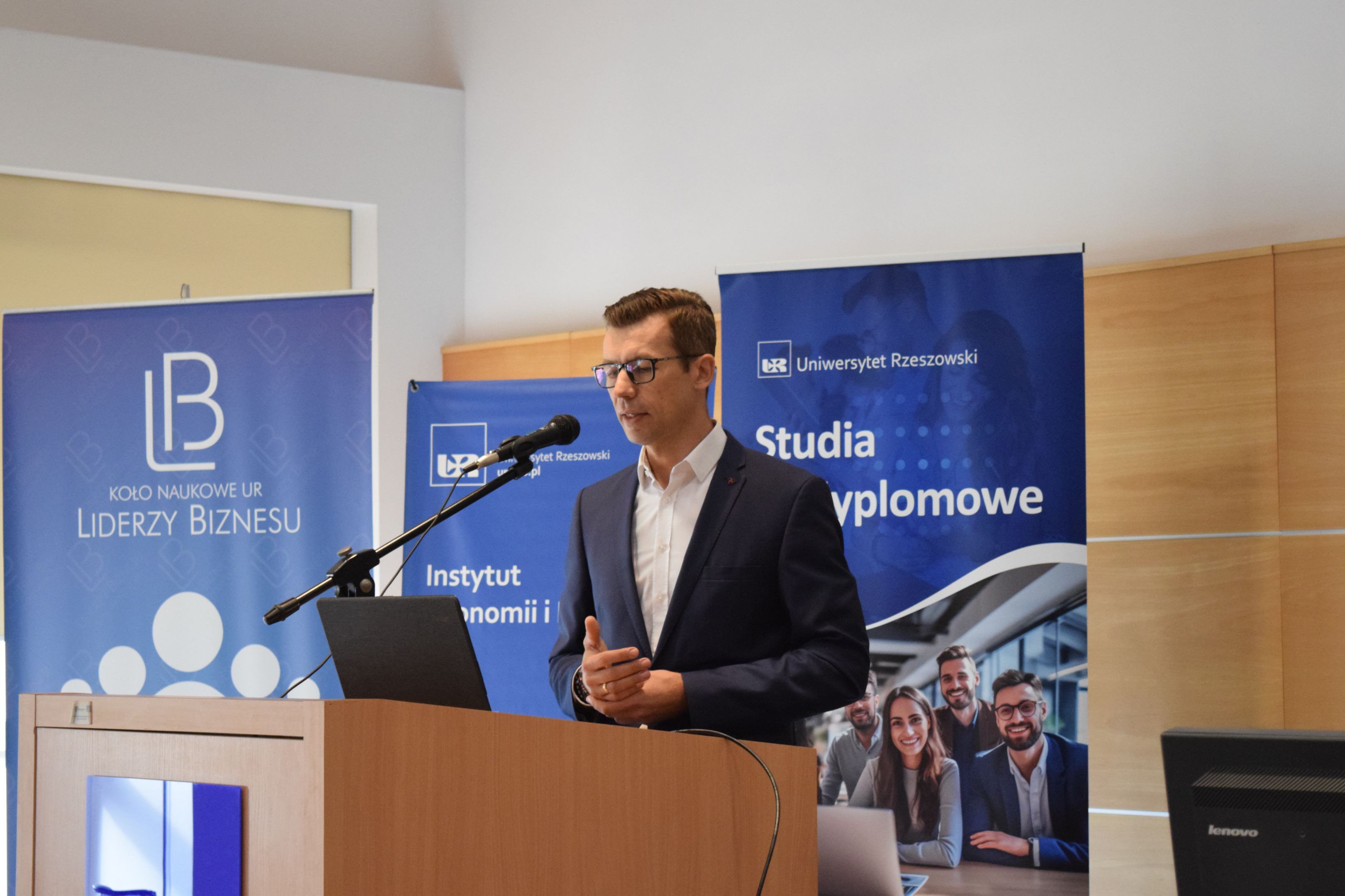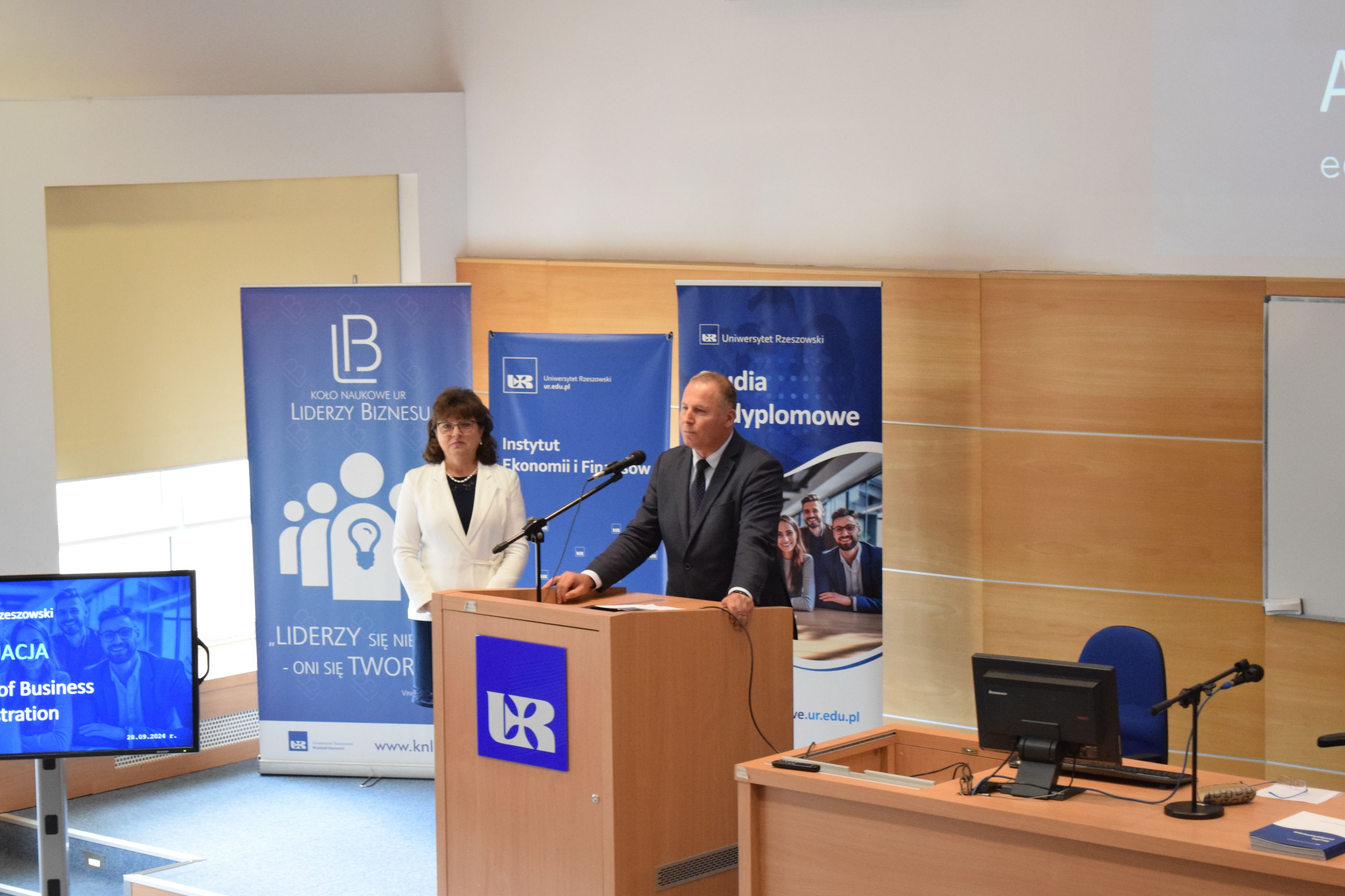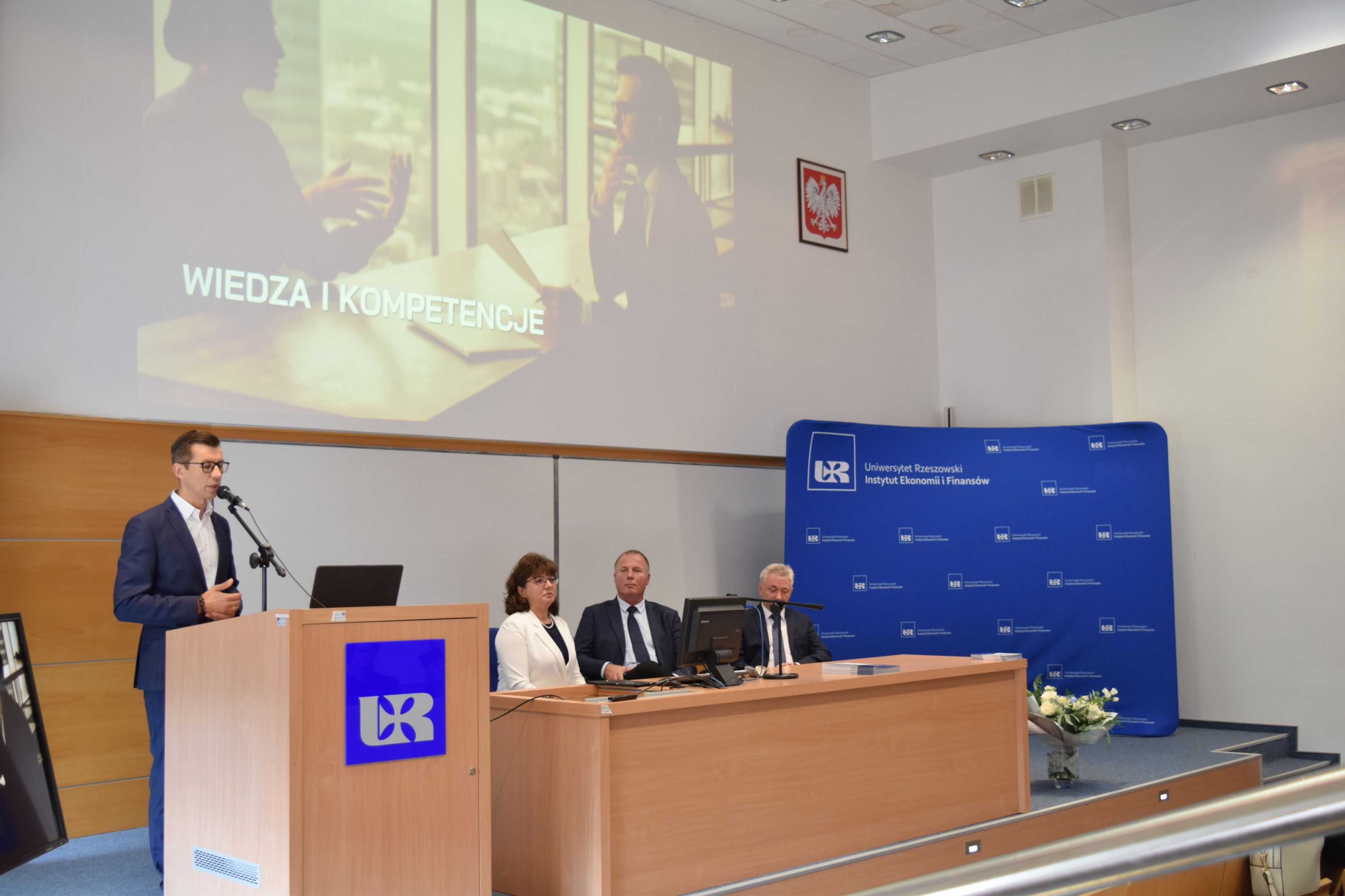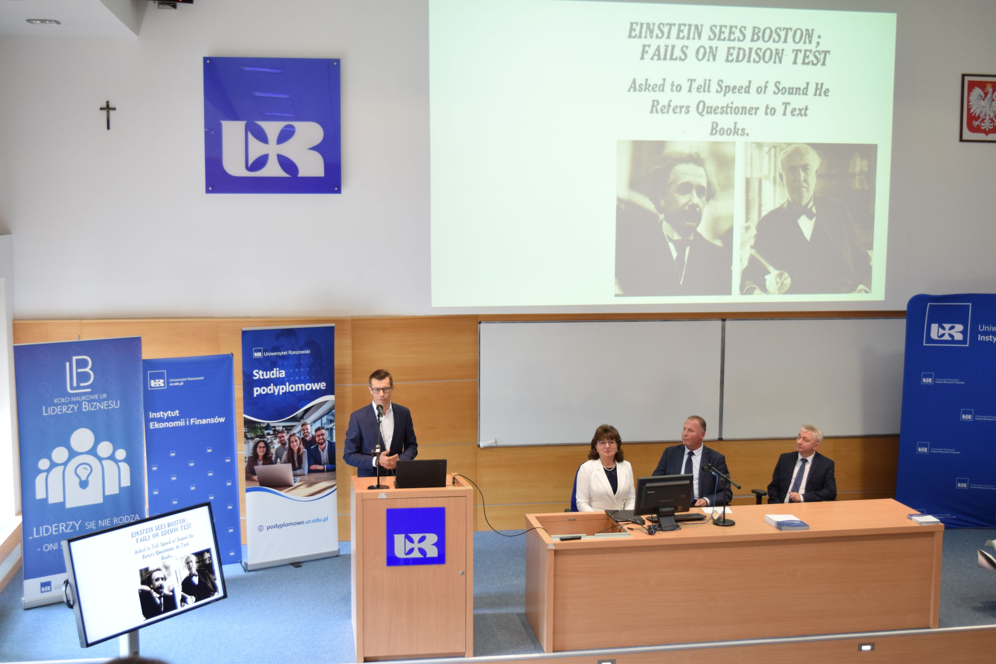 W trakcie uroczystości wykład na temat roli wiedzy i kompetencji we współczesnym zmiennym otoczeniu wygłosił dr hab. Grzegorz Hajduk, prof. UR. Pan Profesor zwrócił uwagę na współczesne problemy procesów biznesowych i stojące wyzwania kadry menedżerskiej na najbliższe lata.