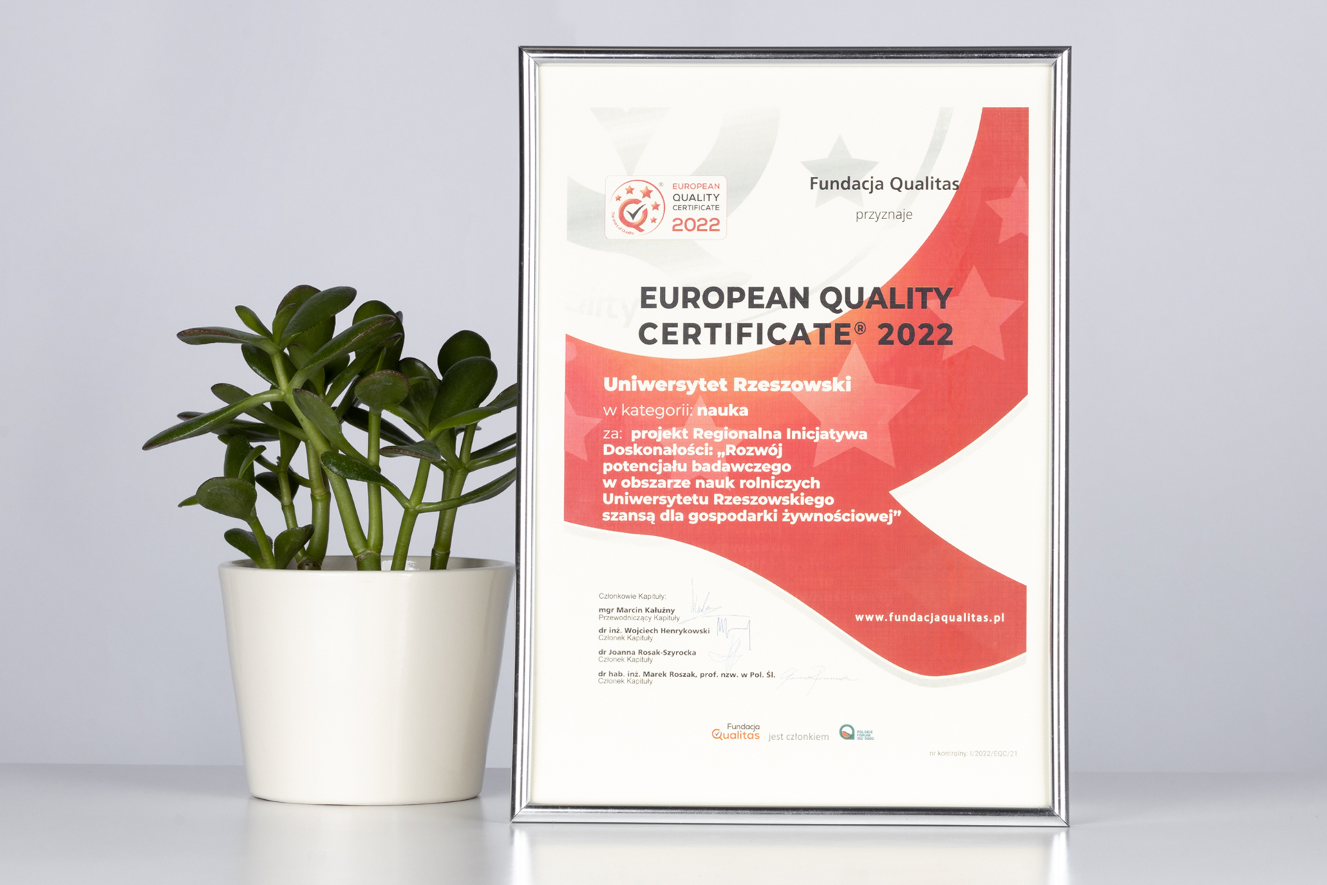 Jest nam niezmiernie miło przekazać informację o przyznaniu Uniwersytetowi Rzeszowskiemu certyfikatu European Quality Certificate ® 2022 - Srebrne wyróżnienie w kategorii Nauka za projekt „Rozwój potencjału badawczego w obszarze nauk rolniczych Uniwersytetu Rzeszowskiego szansą dla gospodarki żywnościowej”, w ramach konkursu Regionalna Inicjatywa Doskonałości.