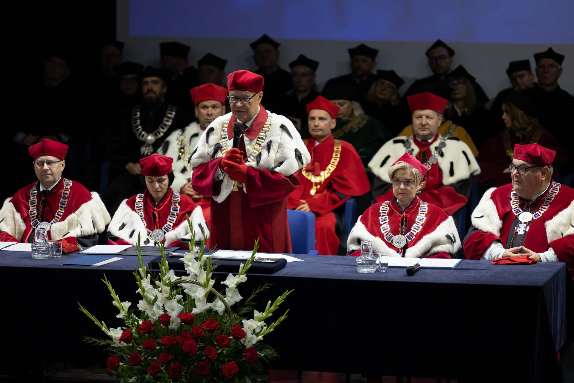W swoim przemówieniu JM Rektor podkreślił, że w trakcie tej uroczystości szczególnie powinniśmy pamiętać o tym, czego dokonaliśmy w poprzednim roku akademickim i wskazać cele, jakie są dopiero przed nami - „Moim marzeniem jest, aby nasz Uniwersytet ciągle potwierdzał tezę Karla Jaspersa: „Istnieje duch poszczególnych uniwersytetów, genius loci, dla którego tłem jest dziejowa atmosfera, ale który wciąż musi być żywy i wciąż na nowo odtwarzany”. Chciałbym w bieżącym roku akademickim dołączyć do Europejskiego Stowarzyszenia Uniwersytetów (EUA – European Univeristy Association) oraz projektu „Uniwersytety Europejskie”. To bardzo ważne aspekty umiędzynarodowienia naszej Uczelni i jej większej rozpoznawalności”.