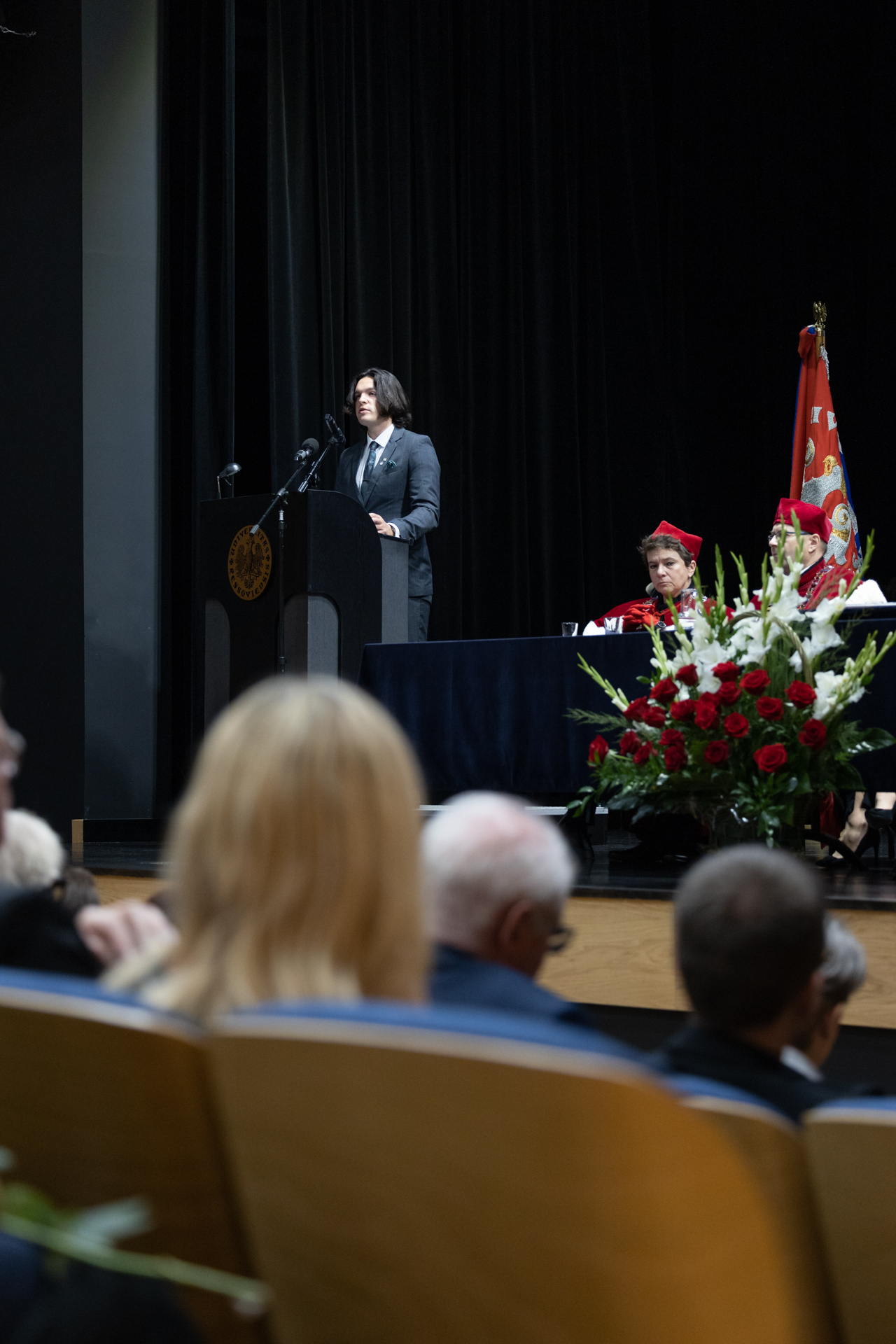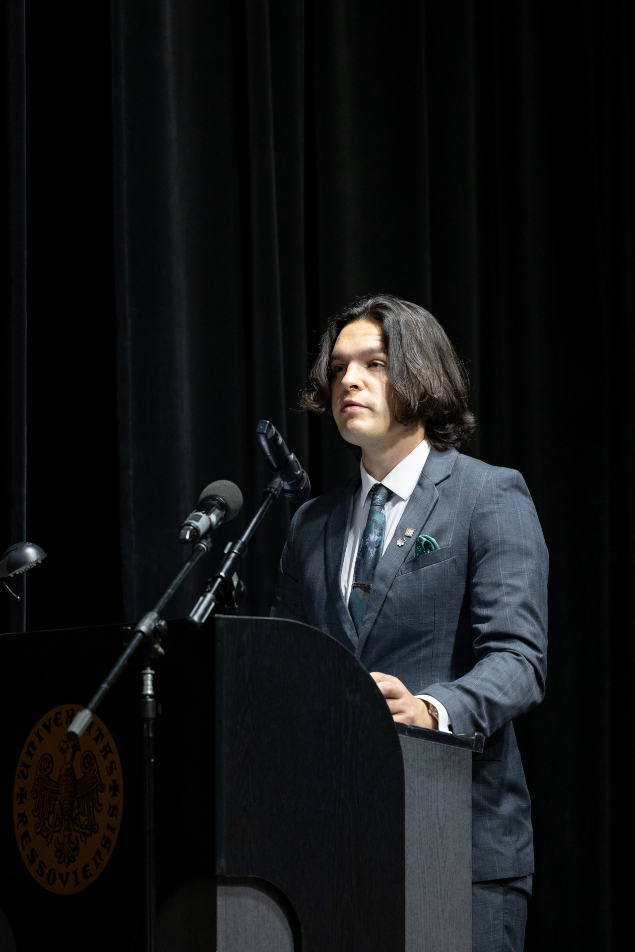 Głos zabrał Przewodniczący Samorządu Studentów Uniwersytetu Rzeszowskiego Bartosz Gabrychowicz, który swoje słowa skierował do koleżanek i kolegów. „Rozpoczynamy kolejny rok, który stawia przed nami nowe wyzwania. […] Jedną z cech społeczności akademickiej jest różnorodność. Każdy z Nas wprowadza do środowiska akademickiego coś niepowtarzalnego- cząstkę siebie. To umożliwia nam wzajemne uzupełnianie się dzisiaj i stabilność jutra.”