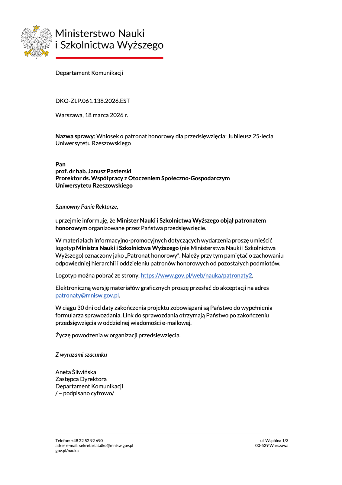 Uniwersytet Rzeszowski z dumą informuje, że Jubileusz 25-lecia naszej Uczelni został objęty honorowym patronatem Ministra Nauki i Szkolnictwa Wyższego.