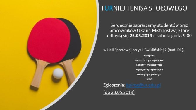 Serdecznie zapraszamy studentów oraz pracowników Uniwersytetu Rzeszowskiego na Mistrzostwa Uniwersytetu Rzeszowskiego w tenisie stołowym, które odbędą się w sobotę 25 maja 2019 r. w Hali Sportowej przy ul. Ćwiklińskiej 2 (bud. D1).