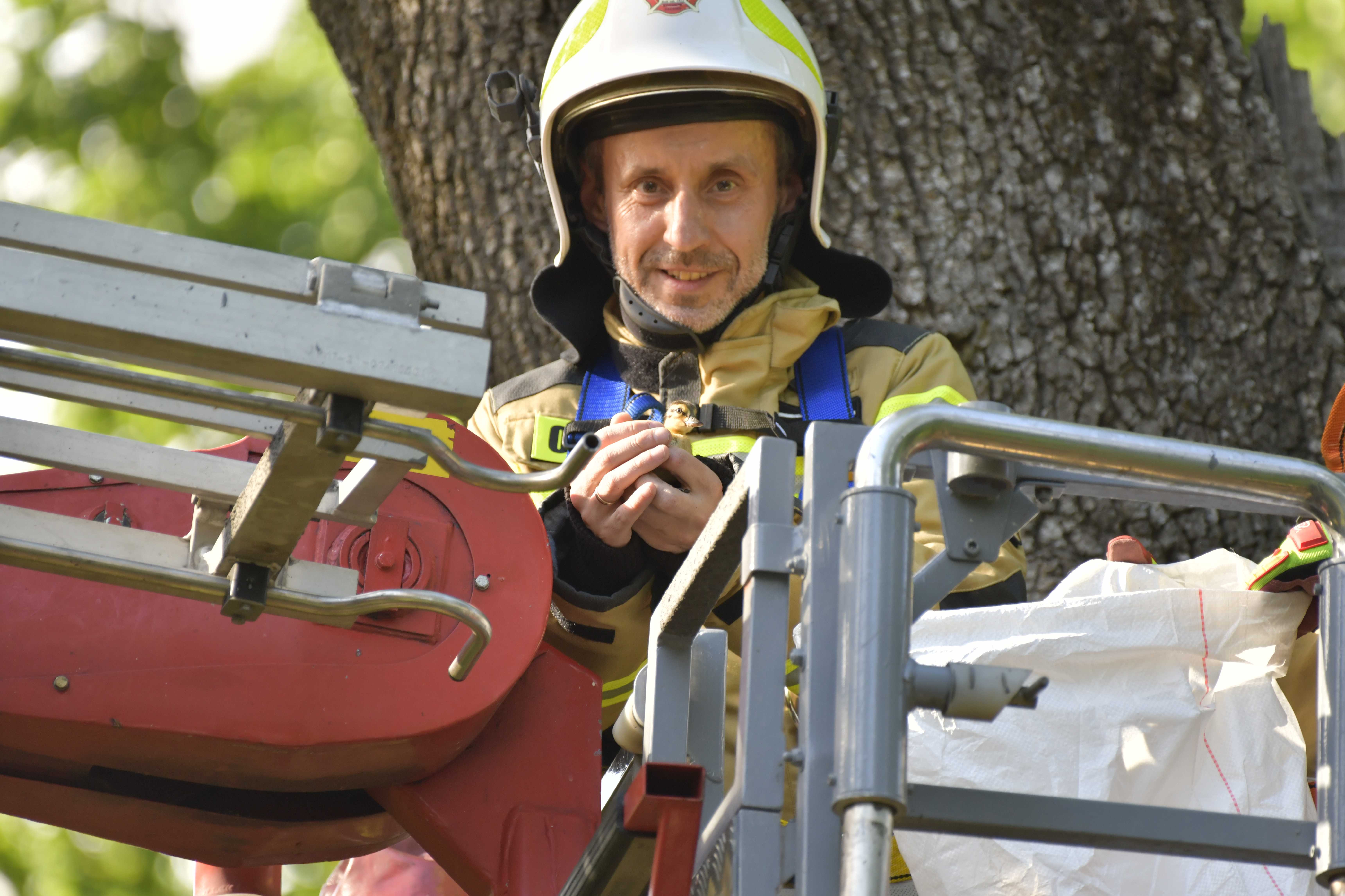 Wówczas zespół ornitologów podjął próbę wydostania piskląt z pechowej dla nich dziupli, jednak najdłuższe drabiny jakie były w dyspozycji okazały się za krótkie. Zdecydowano zatem wezwać straż pożarną, która za pomocą zwyżki bezpiecznie sprowadziła na dół pozostałe 5 piskląt. Ponieważ nadszedł wieczór i nie można było zlokalizować mamy kaczątek do następnego dnia sprawowała nad nimi opiekę dr Natalia Tańska. Maluchy zostały nakarmione i umieszczone w prowizorycznym baseniku z letnią wodą, po czym noc spędziły w tekturowym pudełku.