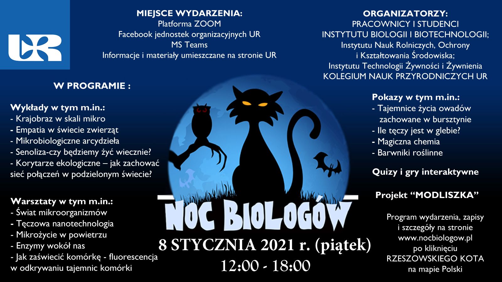 Pracownicy i i studenci Instytutu Biologii i Biotechnologii, Instytutu Nauk Rolniczych, Ochrony i Kształtowania Środowiska, Instytutu Technologii Żywności i Żywienia w Kolegium Nauk Przyrodniczych UR już 8 stycznia 2021 zapraszają na kolejną edycję "Nocy biologów" - szczegóły wydarzenia i zapisy pod adresem - www.nocbiologow.pl - klikamy rzeszowskiego kota na mapie Polski :)