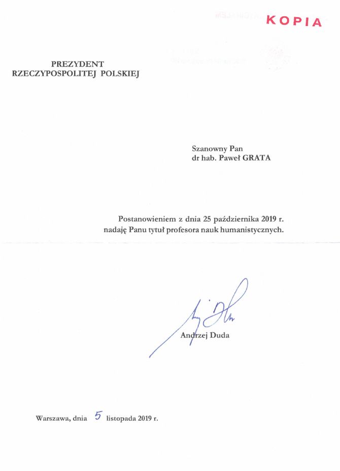 Jest nam bardzo miło poinformować, że Prorektor ds. Kolegium Nauk Humanistycznych prof. dr hab. Paweł Grata otrzymał z rąk Prezydenta RP - Pana Andrzeja Dudy tytuł profesora nauk humanistycznych.
