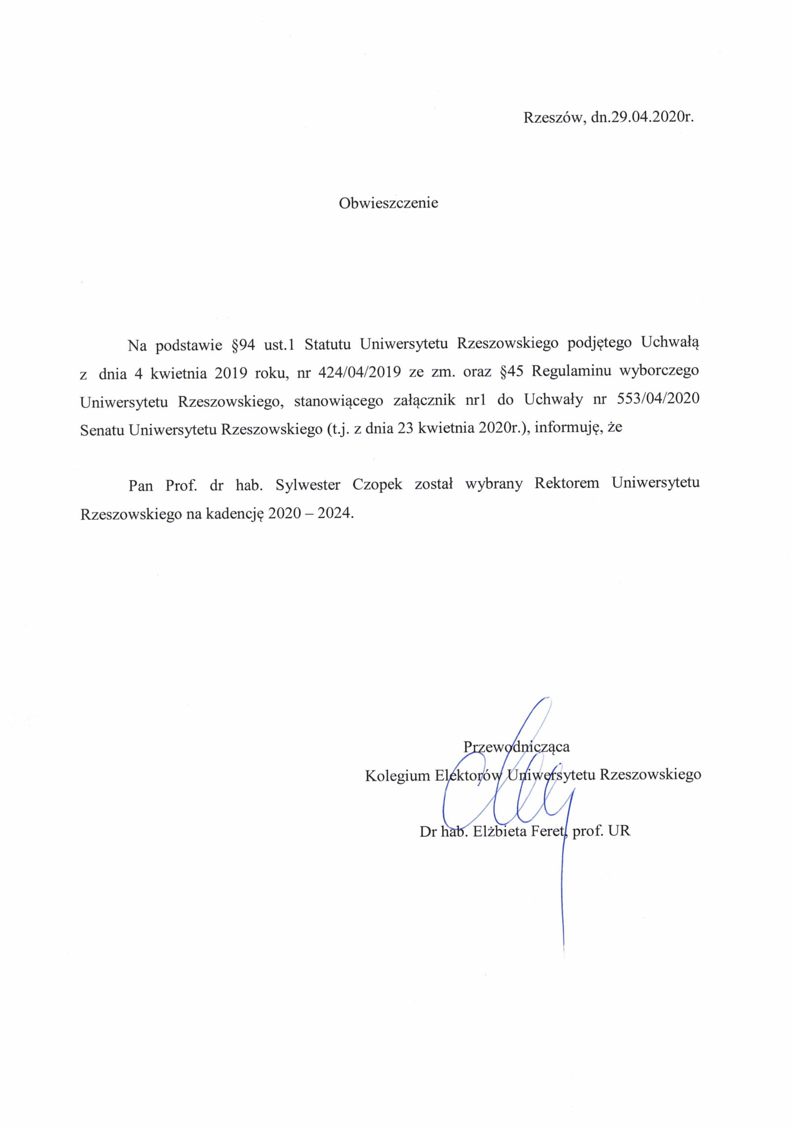 Obwieszczenie wyników wyboru Rektora Uniwersytetu Rzeszowskiego na kadencję 2020-2024
