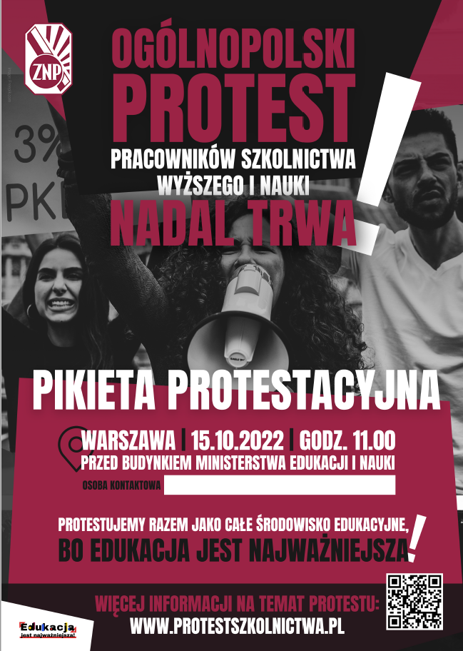 ZNP w Uniwersytecie Rzeszowskim organizuje przejazd autokarami do Warszawy – wyjazd sprzed budynku Rektoratu o godz. 6.00, powrót zaraz po zakończeniu pikiety. Prosimy chętnych do wyjazdu o zgłoszenia mailowo (urz@znp.edu.pl) do czwartku 6 października 2022 r.