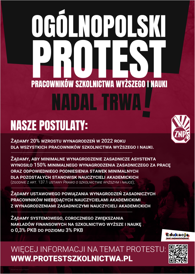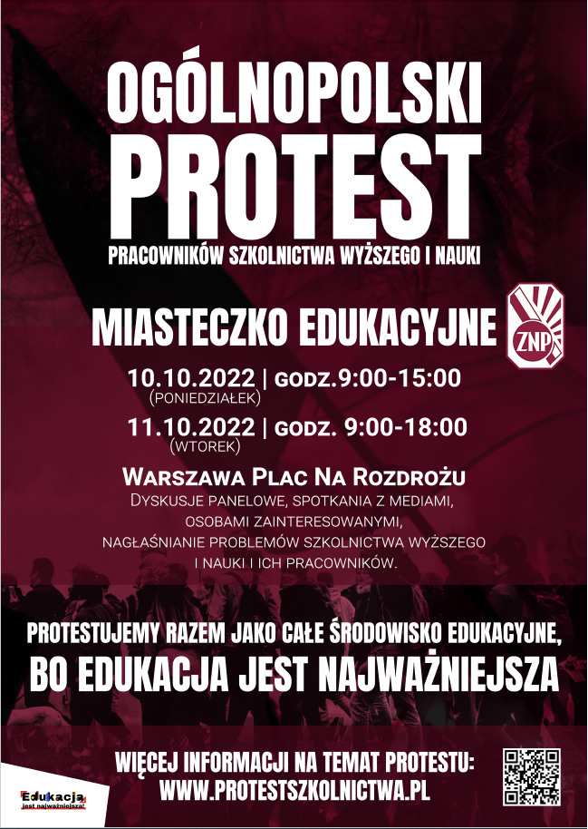 Rada Szkolnictwa Wyższego i Nauki Związku Nauczycielstwa Polskiego, w której zrzeszone są organizacje związkowe działające w uczelniach wyższych i placówkach badawczych, razem z całym Związkiem Nauczycielstwa Polskiego, zrzeszającym pracowników zatrudnionych w placówkach oświatowych podjęła aktualnie wspólny protest dotyczący sytuacji pracowników tych instytucji oraz sytuacji samych instytucji edukacyjnych, bo EDUKACJA JEST JEDNA I NAJWAŻNIEJSZA.