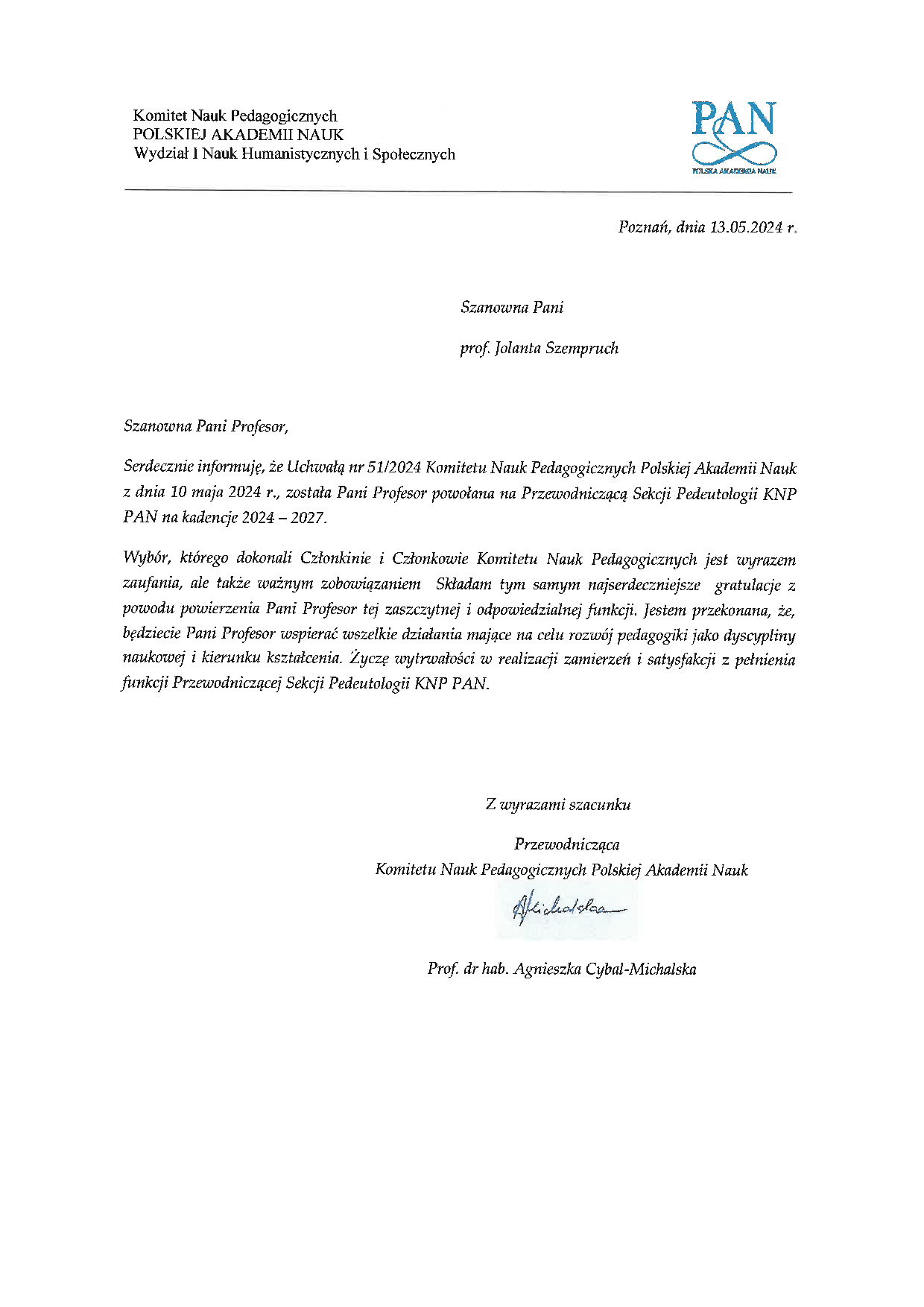 Mamy zaszczyt poinformować, że na mocy Uchwały nr 51/2024 Komitet Nauk Pedagogicznych Polskiej Akademii Nauk w dniu 10 maja 2024 r., powołał Panią Profesor Jolantę Szempruch na Przewodniczącą Sekcji Pedeutologii KNP PAN na kadencje 2024 – 2027