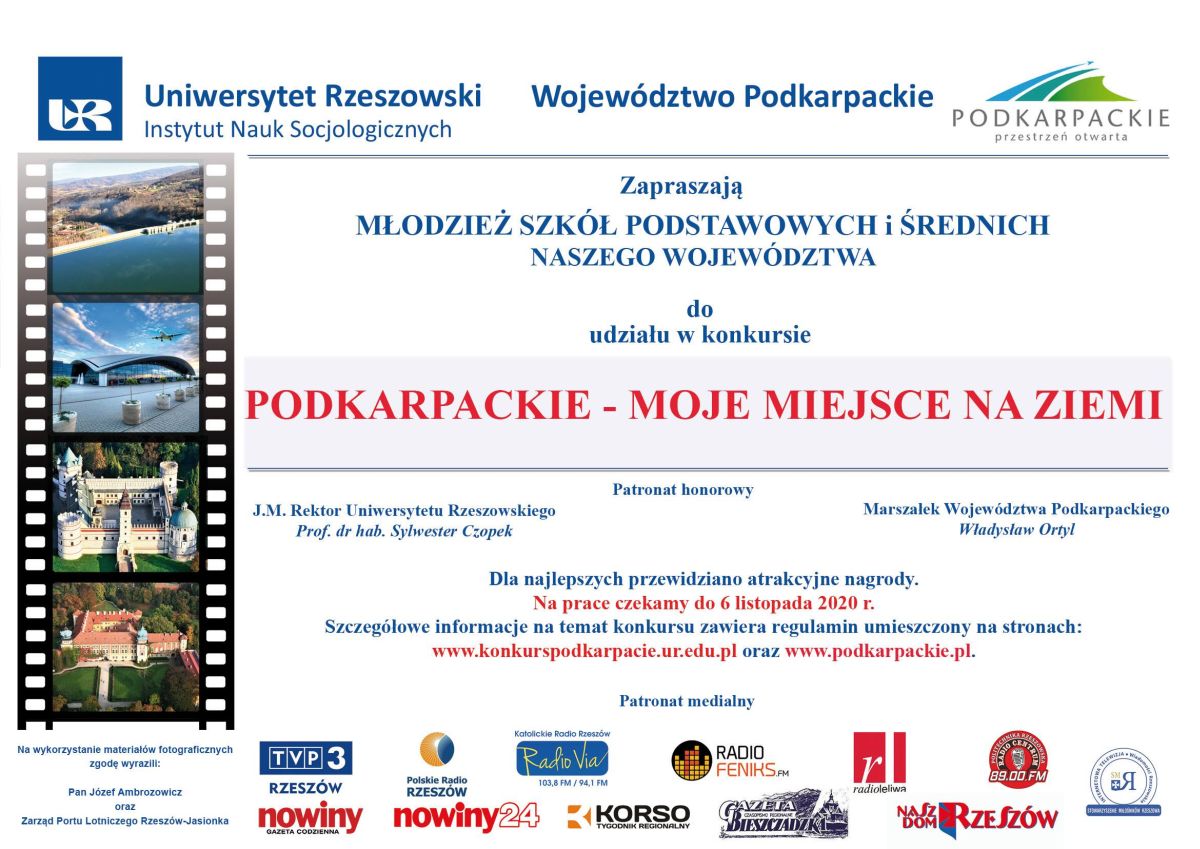 Instytut Nauk Socjologicznych oraz Województwo Podkarpackie zapraszają uczniów szkół podstawowych oraz ponadpodstawowych do udziału w Konkursie "PODKARPACKIE – moje miejsce na ziemi". Szczegółowe informacje na stronie Konkursu