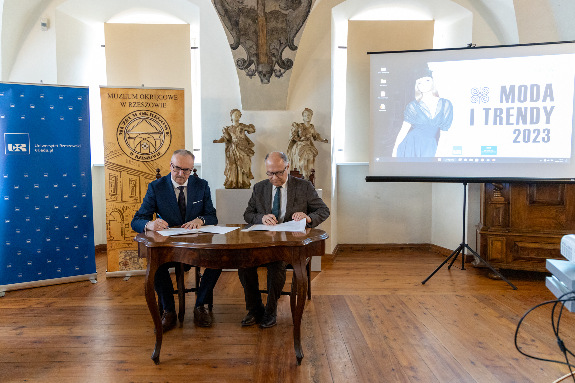 JM prof. dr hab. Sylwester Czopek, Rektor UR oraz dyrektor muzeum, pan Bogdan Kaczmar w obecności zgromadzonych gości podpisali umowę, nawiązującą współpracę w ramach międzynarodowego, interdyscyplinarnego projektu "Moda i trendy", inicjowanego przez Uniwersytet Rzeszowski.