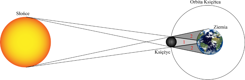 Rys.1. Schemat geometryczny obrazujący zaćmienie Słońca. Na rysunku przyjęto następujące oznaczenia: 1 to obszar (pas), w którym następuje całkowite zaćmienie Słońca, a 2 to obszar (pas), w którym następuje częściowe zaćmienie Słońca.