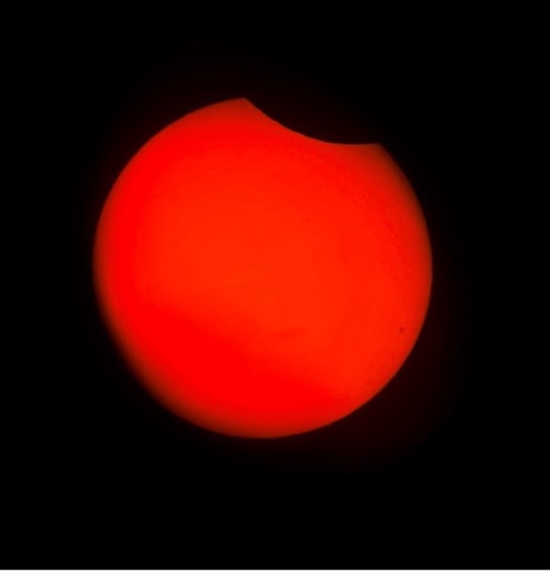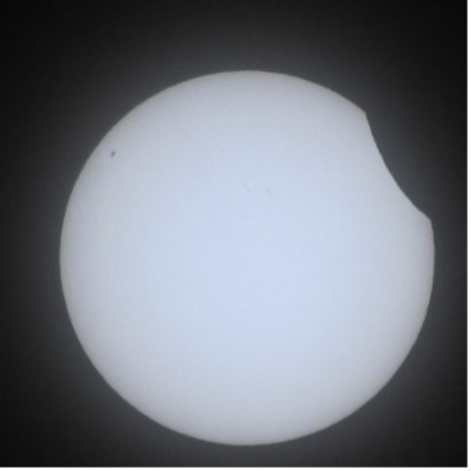 Foto. 2. Maksymalna faza częściowego zaćmienia Słońca – fotografia wykonana przy użyciu cyfrowego aparatu fotograficznego zaopatrzonego w filtr wykonany z foli Baadera.
