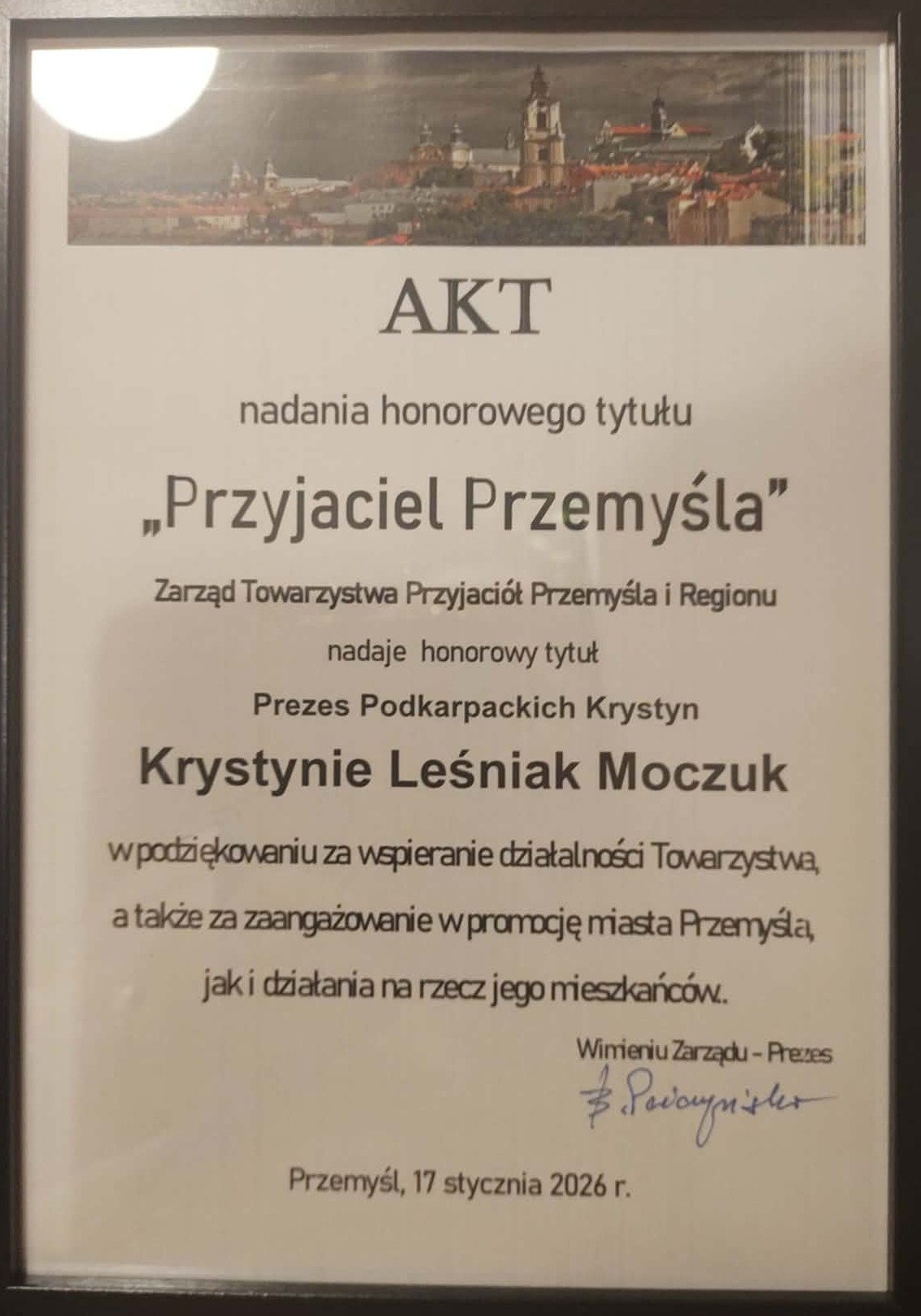 Wyróżnienie to stanowi wyraz uznania za wieloletnie wspieranie działalności Towarzystwa, a także za aktywne zaangażowanie w promocję miasta Przemyśla oraz działania podejmowane na rzecz jego mieszkańców. Doceniono zarówno wkład prof. Krystyny Leśniak-Moczuk w inicjatywy społeczno-kulturalne, jak i jej konsekwentną pracę na rzecz budowania pozytywnego wizerunku miasta w regionie i poza nim.
