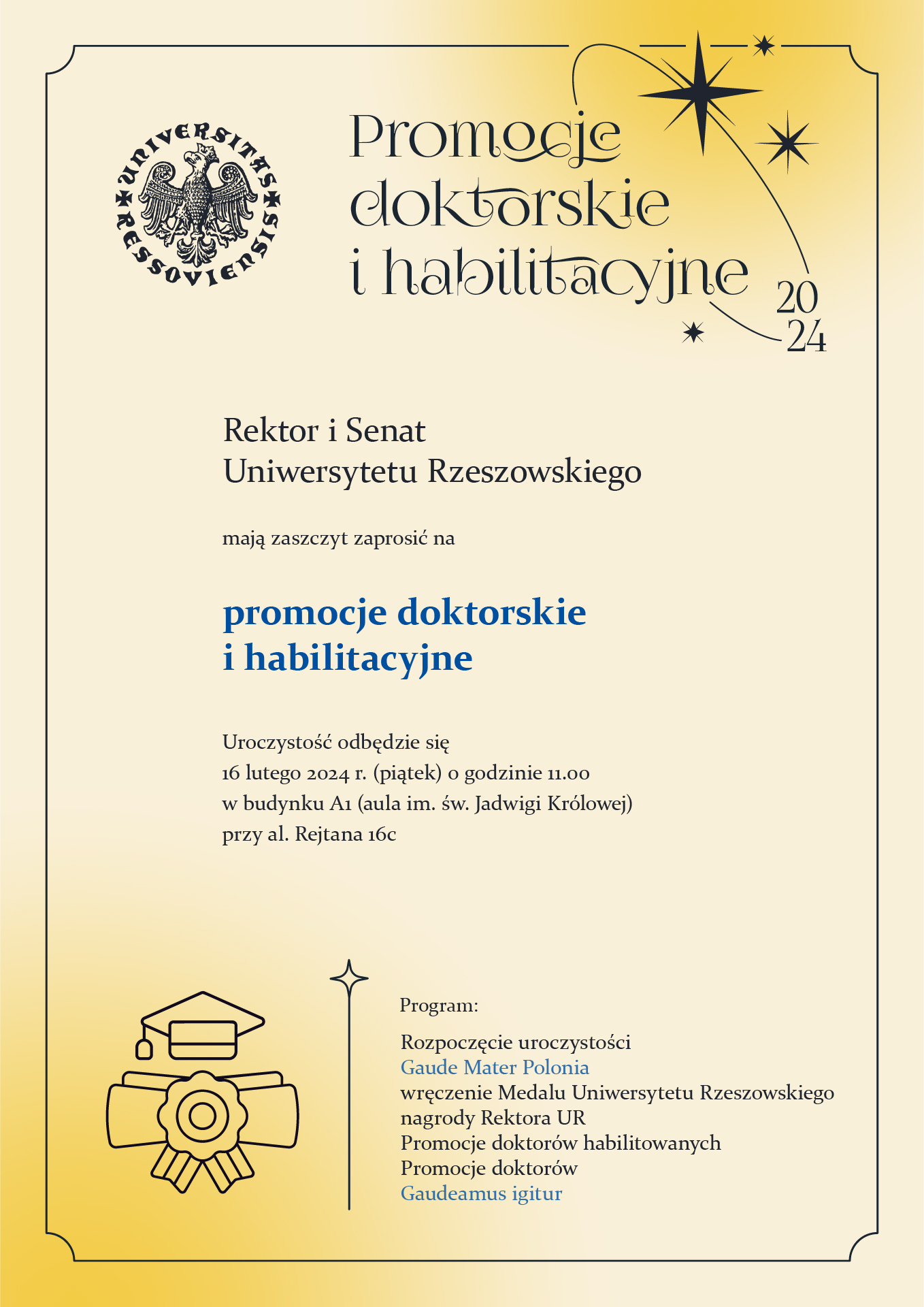 Rektor i Senat Uniwersytetu Rzeszowskiego mają zaszczyt zaprosić na promocje doktorskie i habilitacyjne. Uroczystość odbędzie się 16 lutego br., o godz. 11:00 w budynku A1 (aula im. św. Jadwigi Królowej) przy al. Rejtana 16 c