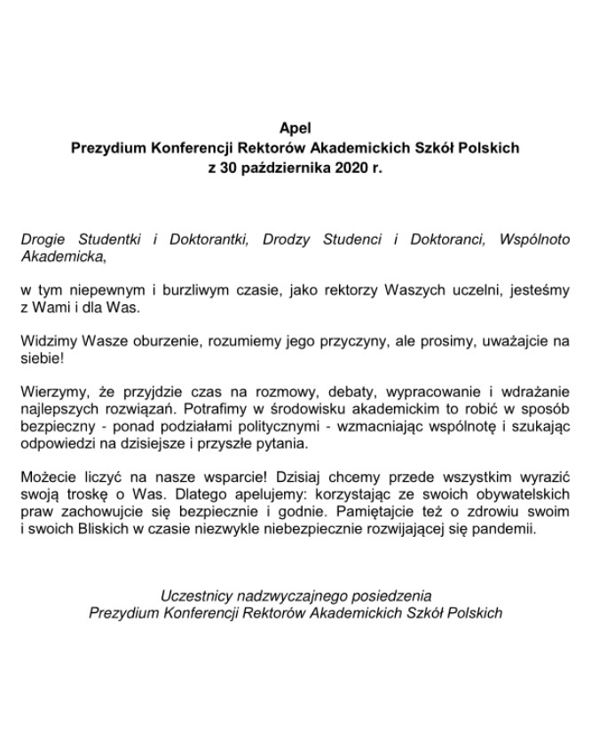 My, Rektorzy Akademickich Szkół Polskich apelujemy do władz państwowych o niezwłoczne znalezienie pokojowych dróg wyjścia z sytuacji, w jakiej znalazło się polskie społeczeństwo po orzeczeniu Trybunału Konstytucyjnego.