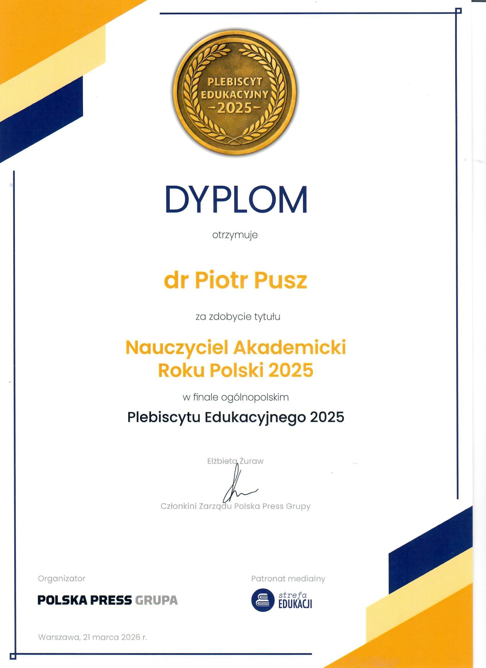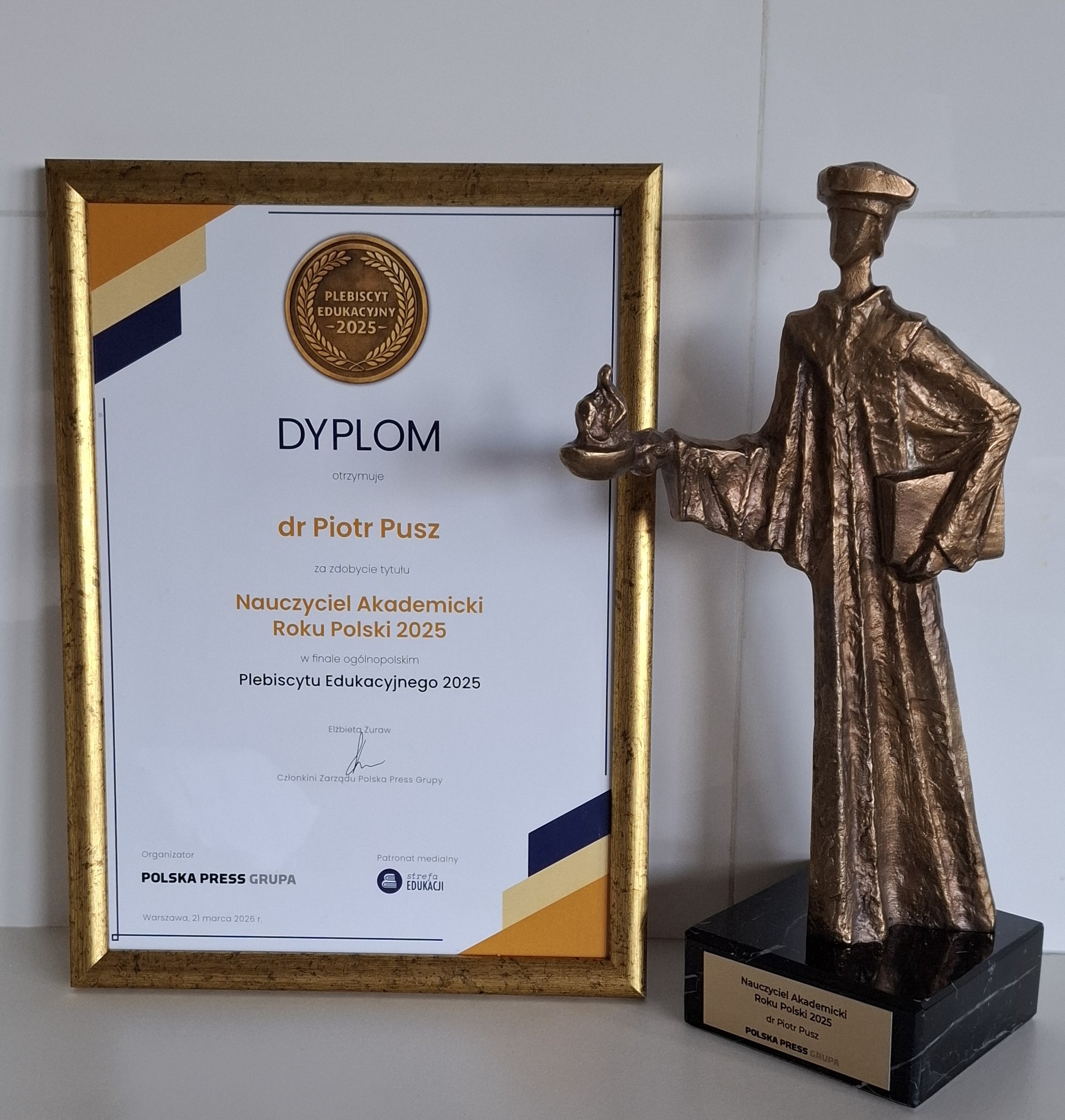 Z ogromną dumą informujemy, że dr Piotr Pusz z Wydziału Nauk Ścisłych i Technicznych Uniwersytetu Rzeszowskiego zdobył I miejsce w ogólnopolskim finale Plebiscytu Edukacyjnego 2025 w kategorii Nauczyciel Akademicki.