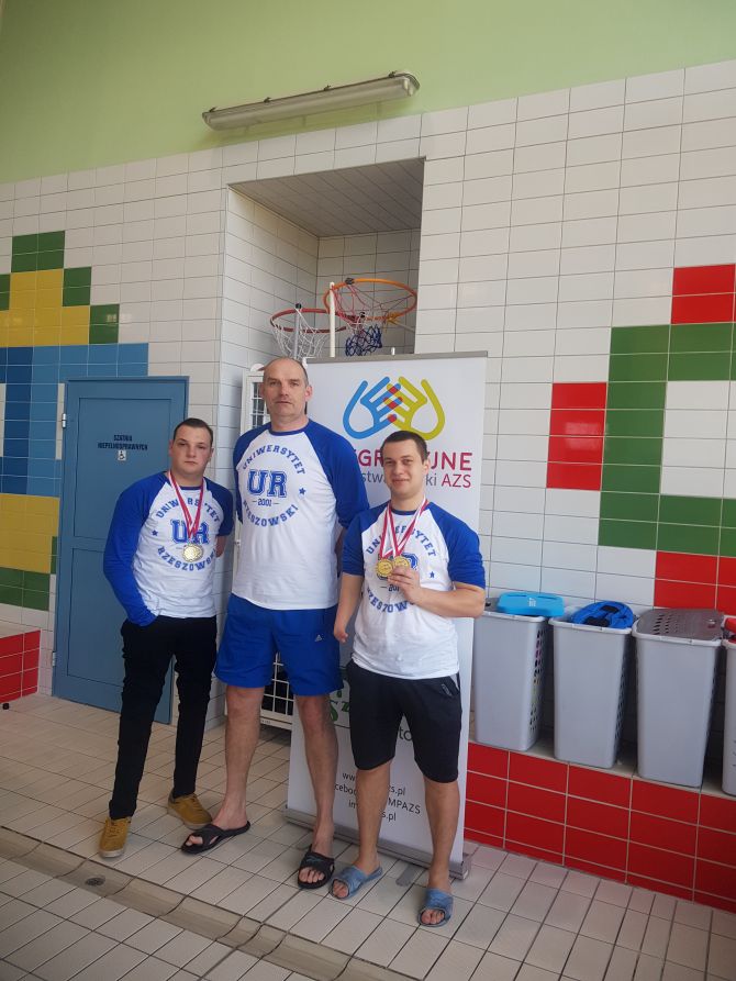 W dniu 10 maja 2019 r. w Poznaniu odbyły się IV Integracyjne Mistrzostwa Polski AZS w Pływaniu, w których wzięło udział blisko 80 zawodników reprezentujących 19 uczelni wyższych z terenu całej Polski. Biuro ds. Osób Niepełnosprawnych oraz Klub Uczelniany AZS Uniwersytetu Rzeszowskiego reprezentowali dwaj zawodnicy: Mateusz Zięba, student IV roku na Wydziale Prawa i Administracji oraz Dominik Dendura, student II roku na Wydziale Matematyczno-Przyrodniczym. Pływacy po raz kolejny nie zawiedli. Miło nam poinformować że Mateusz Zięba podczas tych zawodów wywalczył złoty i srebrny medal na dystansach 25 i 50 m stylem dowolnym. Student w tego typu zawodach brał udział czwarty raz i zdobył w sumie 8 medali (7 złotych i 1 srebrny). Drugi reprezentant UR Dominik Dendura, w mistrzostwach startował po raz pierwszy i zdobył w swojej kategorii 2 złote medale, również na dystansach 25 i 50 m stylem dowolnym. Należy dodać, że student z pływaniem zetknął się po raz pierwszy dwa lata temu podczas alternatywnych zajęć z wf organizowanych przez BON UR dla studentów z niepełnosprawnością. Studenci na co dzień trenują pod okiem trenerów dr Iwony Tabaczek-Bejster oraz mgr Artura Szymańskiego. Serdecznie gratulujemy, czekamy na dalsze sukcesy.