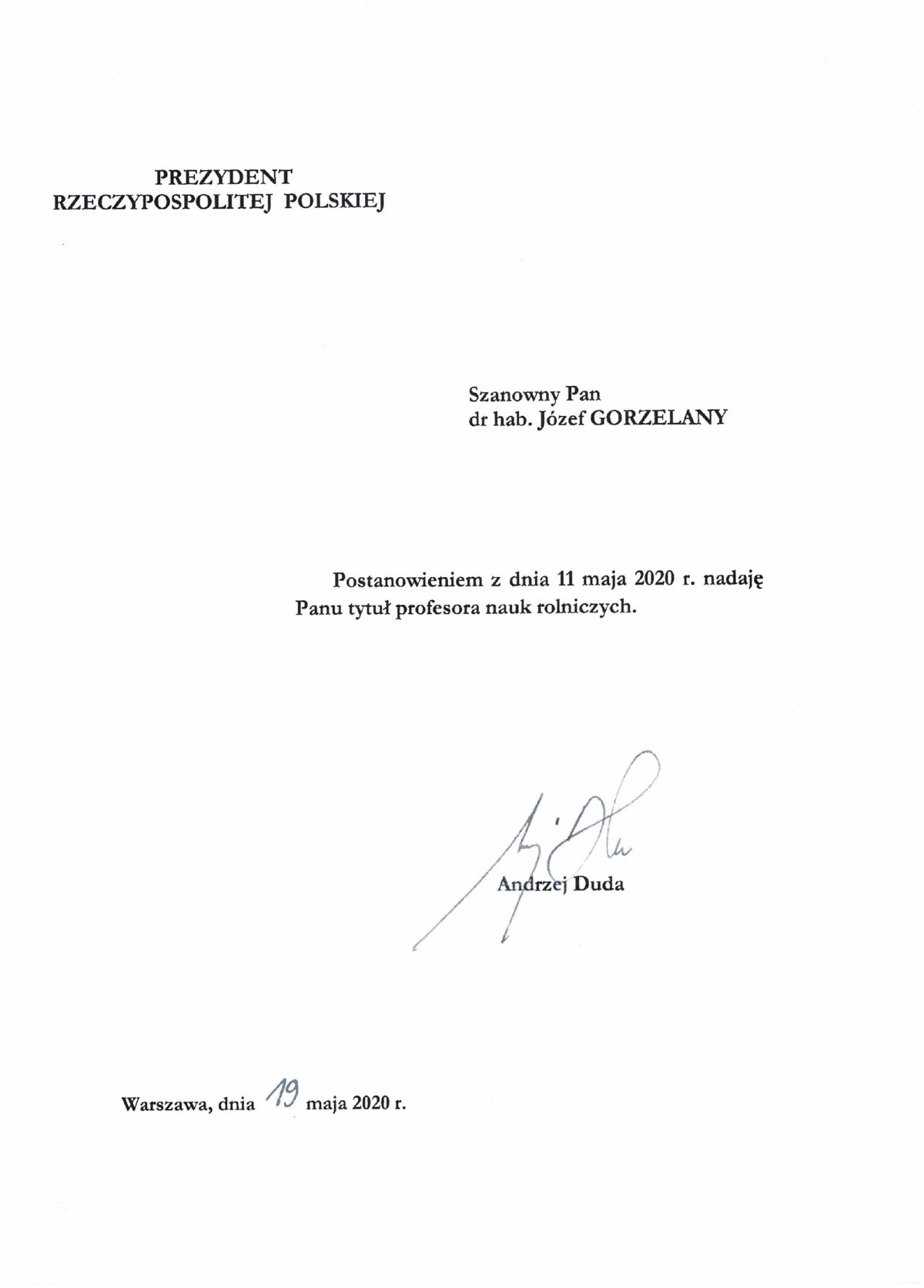 Jest nam bardzo miło poinformować, że Pan Profesor Józef Gorzelany z Kolegium Nauk Przyrodniczych 19 maja 2020 r., otrzymał od Prezydenta RP, Andrzeja Dudy tytuł profesora nauk rolniczych.
