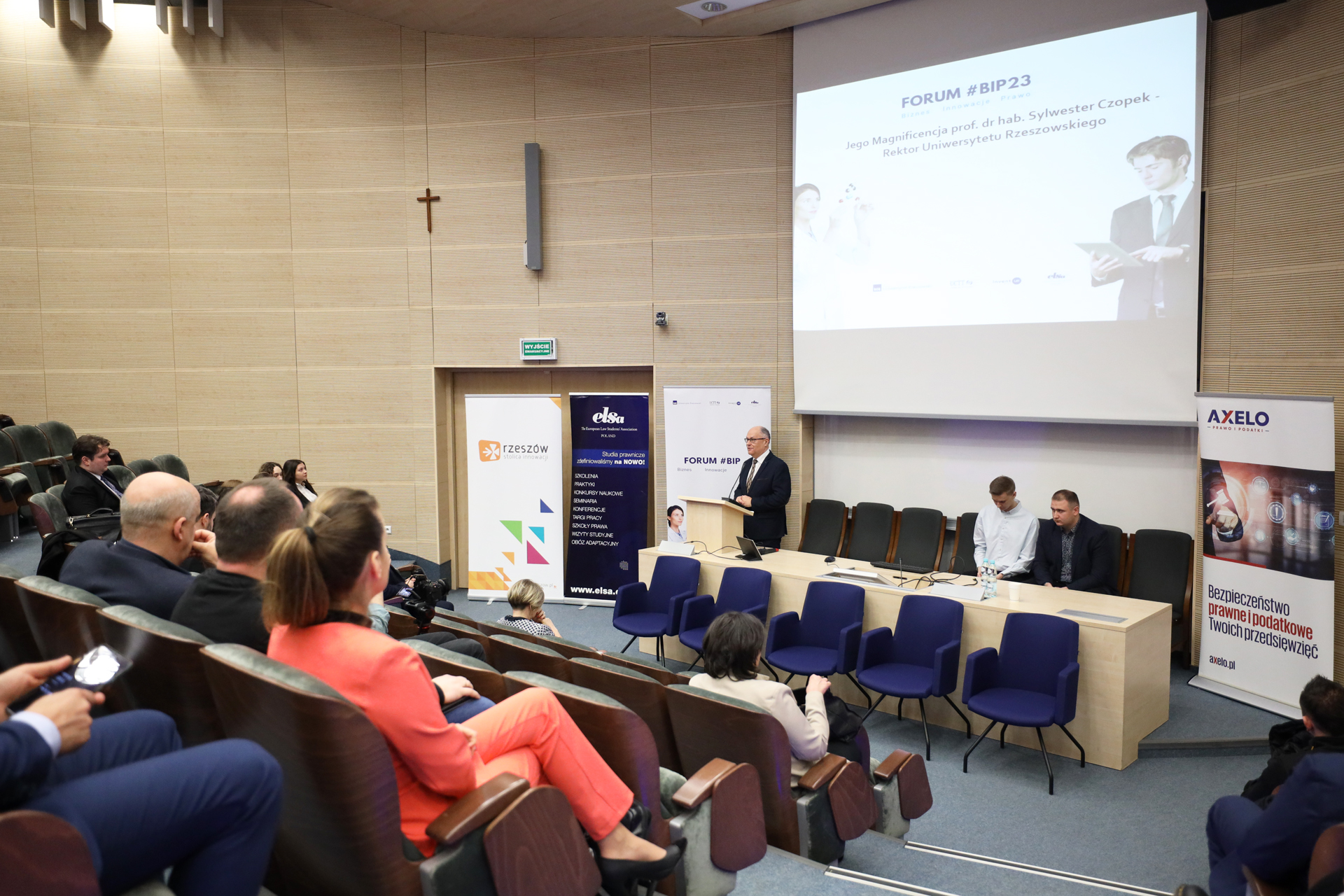 Forum #BIP23 (Biznes-Innowacje-Prawo), odbyło się w dniu 4.04.2023 r., w auli budynku A0 Uniwersytetu Rzeszowskiego przy ul. Pigonia 1 w Rzeszowie. Organizatorami Forum byli Uniwersytet Rzeszowski, InventUR sp. z o.o. (spółka celowa UR) oraz Europejskie Stowarzyszenie Studentów Prawa ELSA Rzeszów.