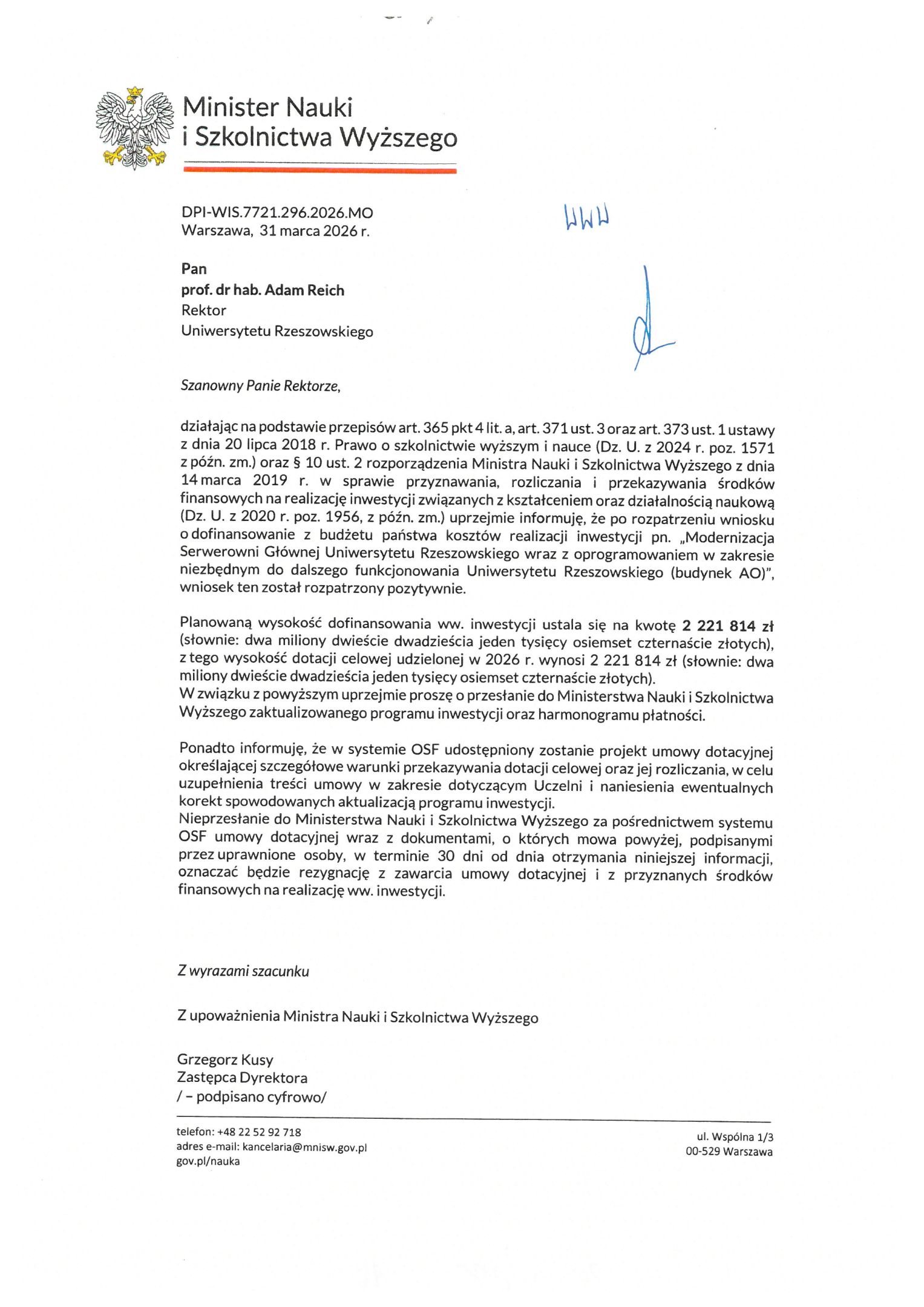 W najbliższym czasie Uniwersytet Rzeszowski przekaże do Ministerstwa zaktualizowany program inwestycji oraz harmonogram płatności. Kolejnym etapem będzie podpisanie umowy dotacyjnej za pośrednictwem systemu OSF, która określi szczegółowe warunki realizacji i rozliczenia projektu.