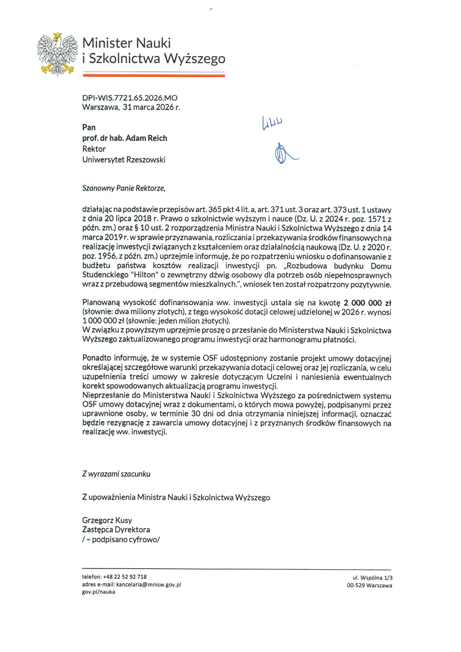 Uniwersytet Rzeszowski otrzymał dofinansowanie z budżetu państwa na realizację inwestycji związanej z modernizacją Domu Studenckiego „Hilton”. Decyzja została podjęta przez Ministra Nauki i Szkolnictwa Wyższego po pozytywnym rozpatrzeniu wniosku uczelni.