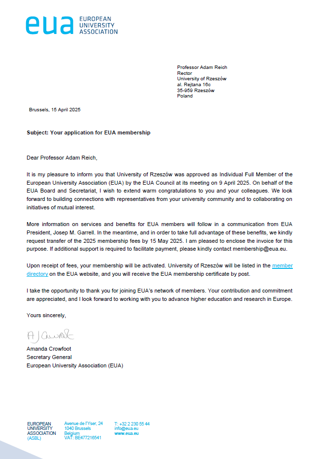 Z radością informujemy, że Uniwersytet Rzeszowski dołącza do prestiżowego grona European University Association (EUA) – największej organizacji reprezentującej uczelnie wyższe w Europie.