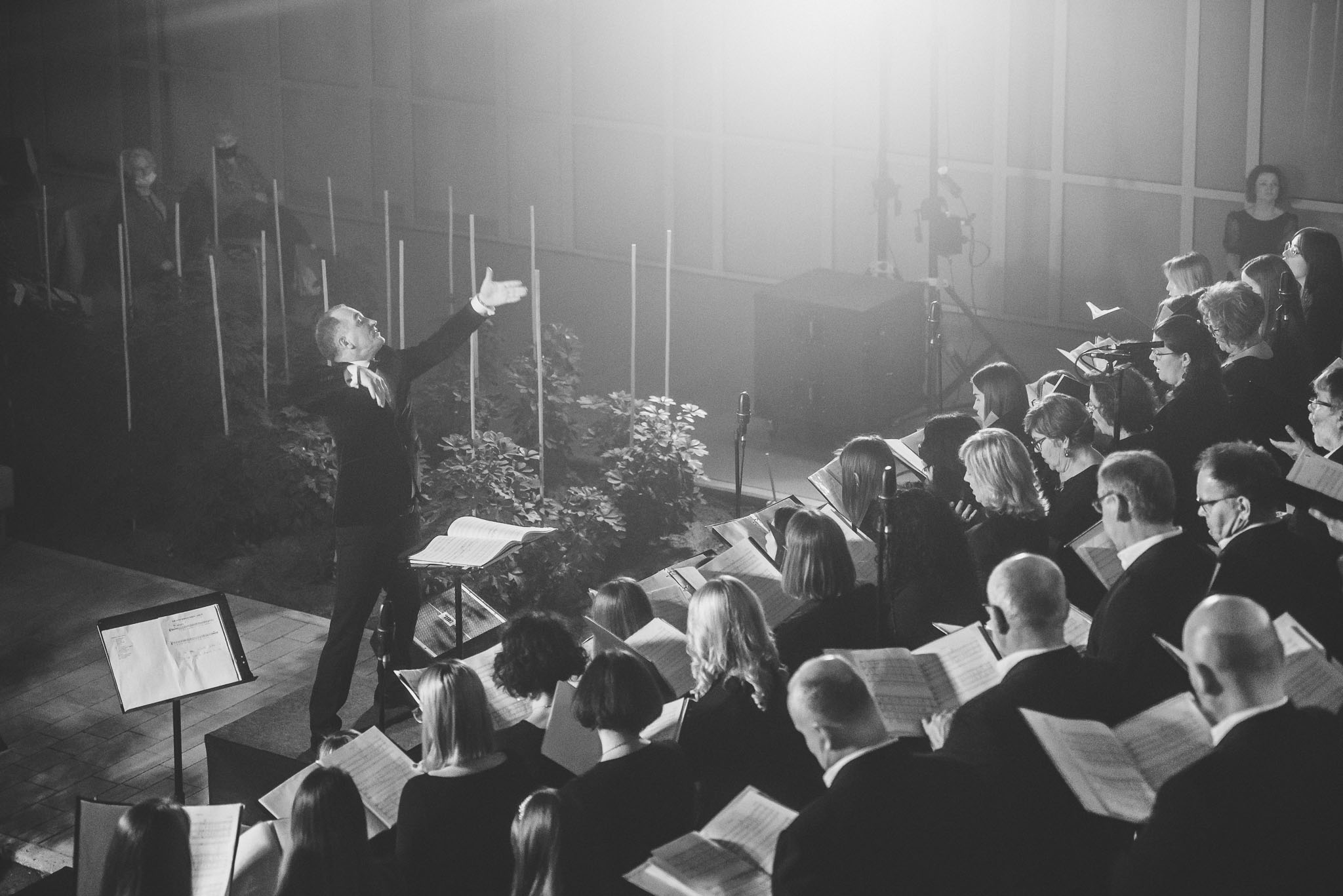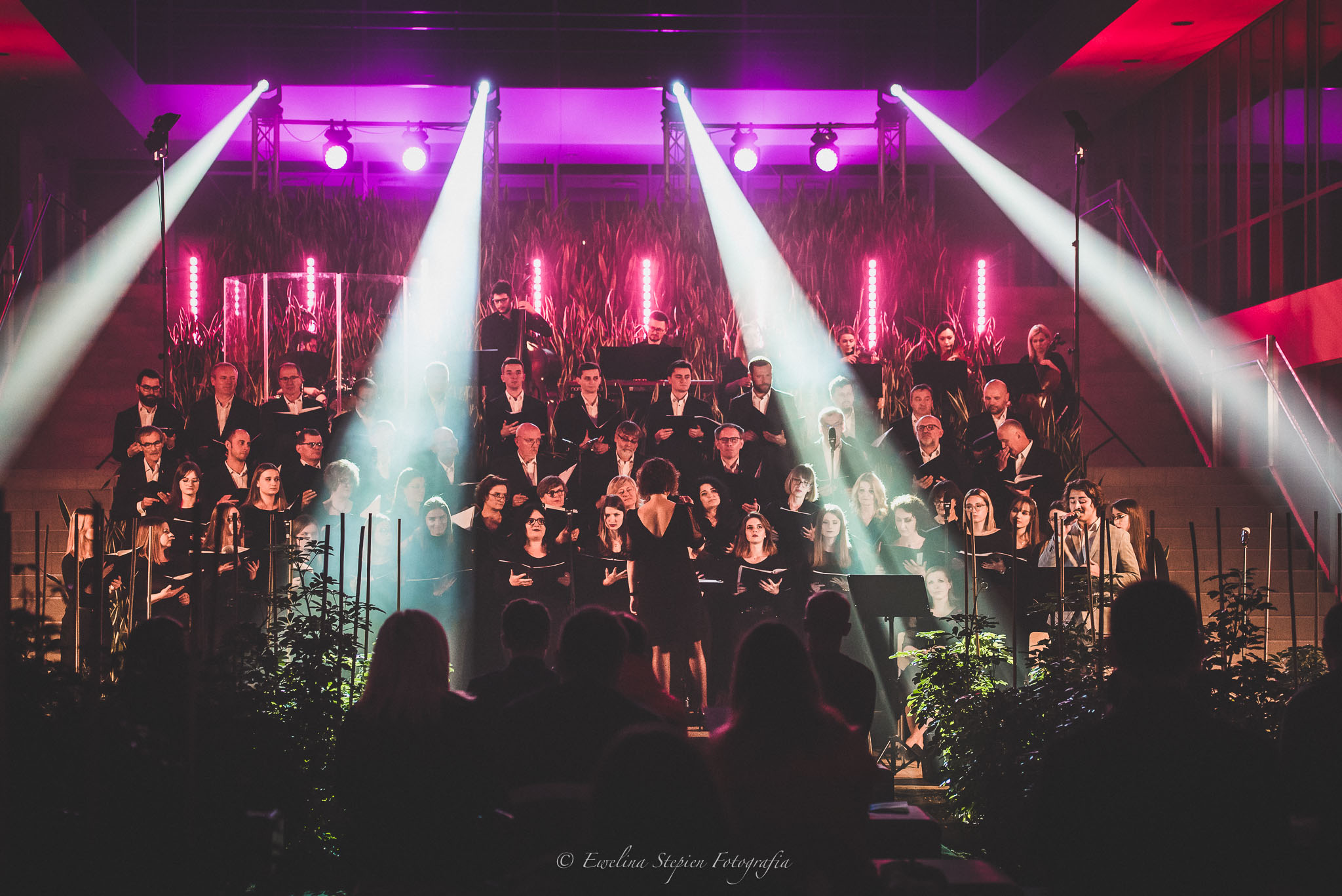 Organizatorom czerwcowego koncertu „Polska liryka chóralna” w Auli A0 Uniwersytetu Rzeszowskiego pozostał pewien niedosyt. Nie tyle z powodów muzycznych, choć jak wiadomo, zawsze może być lepiej, ale biorąc pod uwagę wizualny odbiór koncertu. Na przeszkodzie nie stanęła bynajmniej nieudolność wykonawców czy brak pomysłu na realizację oświetlenia w tej wyjątkowej przestrzeni ale natura, decydująca o długości dnia w tej porze roku. Konsekwentnym więc postanowieniem stał się pomysł próby ponownej organizacji projektu artystycznego w tym miejscu, w czasie umożliwiającym pełne ukazanie potencjału wizualnego uniwersyteckich ekspozycji. Długie, listopadowe wieczory stały się inspiracją do ponownego wypełnienia dźwiękiem i słowem serca naszej Alma Mater, a Święto Odzyskania Niepodległości stało się podnietą do przeniesienia patriotycznego poruszenia z ulicznego bruku do tego wyjątkowego miejsca.