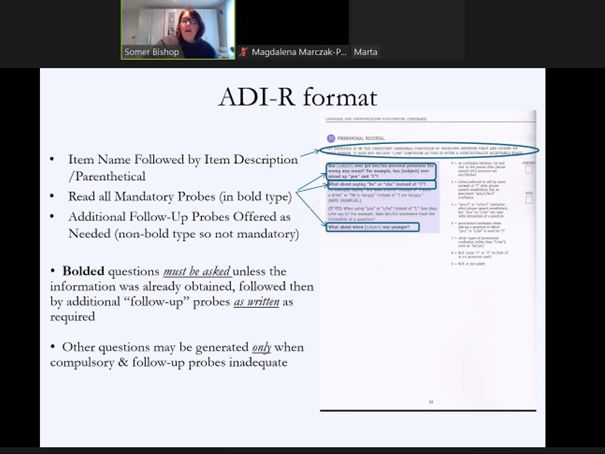Przez trzy dni uczestnicy mieli możliwość zapoznać się z narzędziem diagnostycznym, jakim jest wywiad ADI-R, jego specyfiką, formą zadawanych pytań w sposób ustrukturyzowany i wystandaryzowany oraz obliczania wyników końcowych prezentowanych do diagnozy. Drugi dzień szkolenia poświęcony był na pracę własną w samodzielnej ocenie na podstawie informacji zawartych w nagranym, szkoleniowym wywiadzie sesji ADI-R z rodzicem pacjenta. Piątkowe spotkanie przeznaczone zostało na omówienie pracy własnej uczestników, oraz dyskusję nad uzyskanymi ocenami do konsensusu i diagnozy.