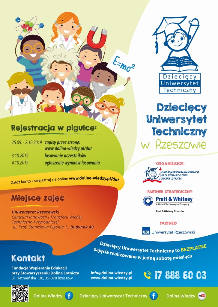 Po raz kolejny Fundacja Wspierania Edukacji przy Stowarzyszeniu Dolina Lotnicza, ogłasza nabór na zajęcia Dziecięcego Uniwersytetu Technicznego. Zapisy online na semestr zimowy 2019-2020 startują 25 września 2019 o godz. 10. Na zajęcia w Rzeszowie, ponownie zostanie przyjętych 468 dzieci z całego województwa podkarpackiego.