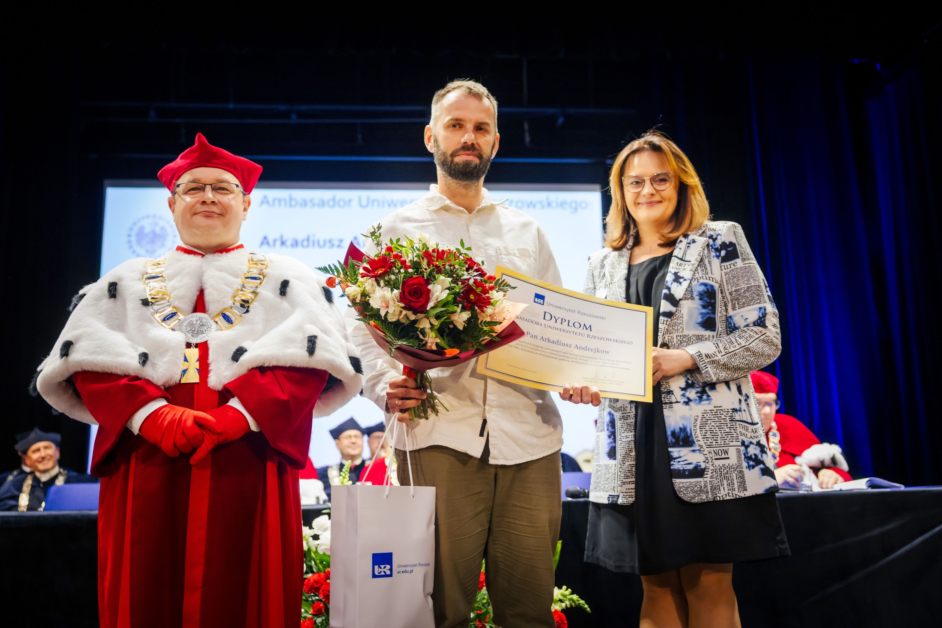 W roli Ambasadora Uniwersytetu Rzeszowskiego Arkadiusz Andrejkow w praktyce udowadnia, że edukacja artystyczna nie kończy się na pracowni, lecz może przekładać się na działania potrzebne ludziom i jest głęboko zakorzeniona w konkretnym miejscu. Jego realizacje porządkują lokalną pamięć i uruchamiają rozmowę o historii, a przy okazji tworzą rozpoznawalny, współczesny język wizualny regionu — taki, w którym zwykła, codziennie mijana ściana potrafi stać się punktem odniesienia dla całej społeczności, bo często opowiada o „czyichś” przodkach, sąsiadach i wspólnych biografiach.