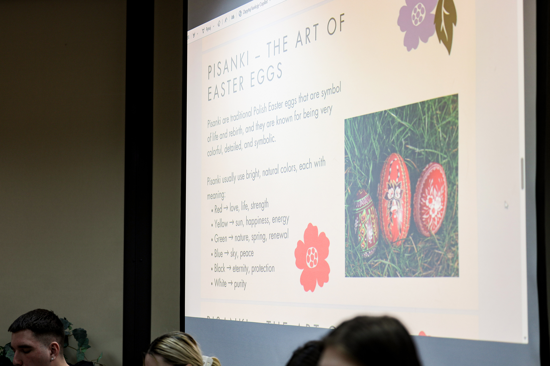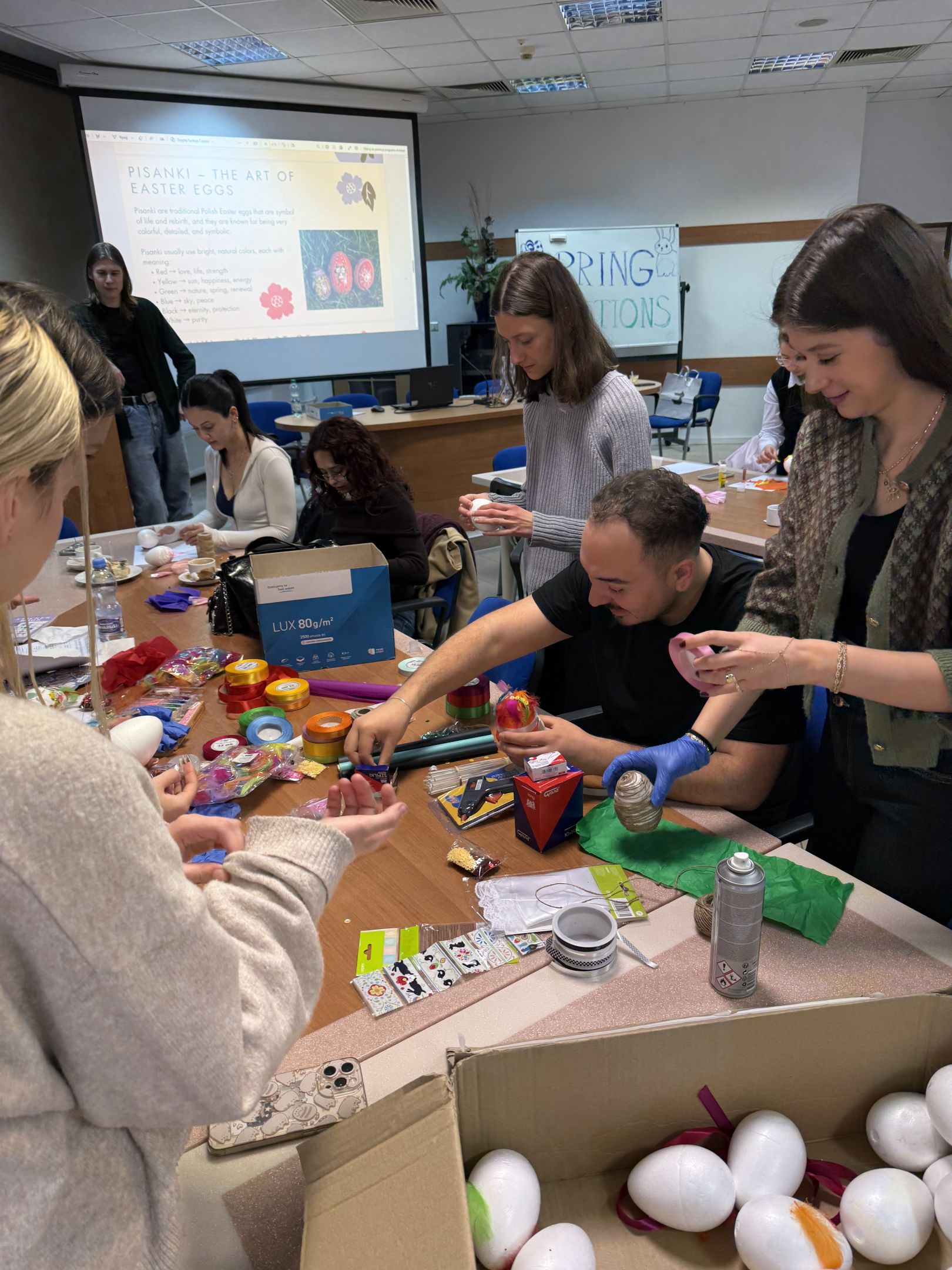 Spotkanie studentów programu Erasmus poświęcone było tematyce Świąt Wielkanocnych i różnorodnych zwyczajów wiosennych w Polsce. Na początku wydarzenia odbyła się prezentacja dotycząca tradycji wielkanocnych w Polsce, dzięki której uczestnicy mogli lepiej poznać lokalne zwyczaje i ich znaczenie.