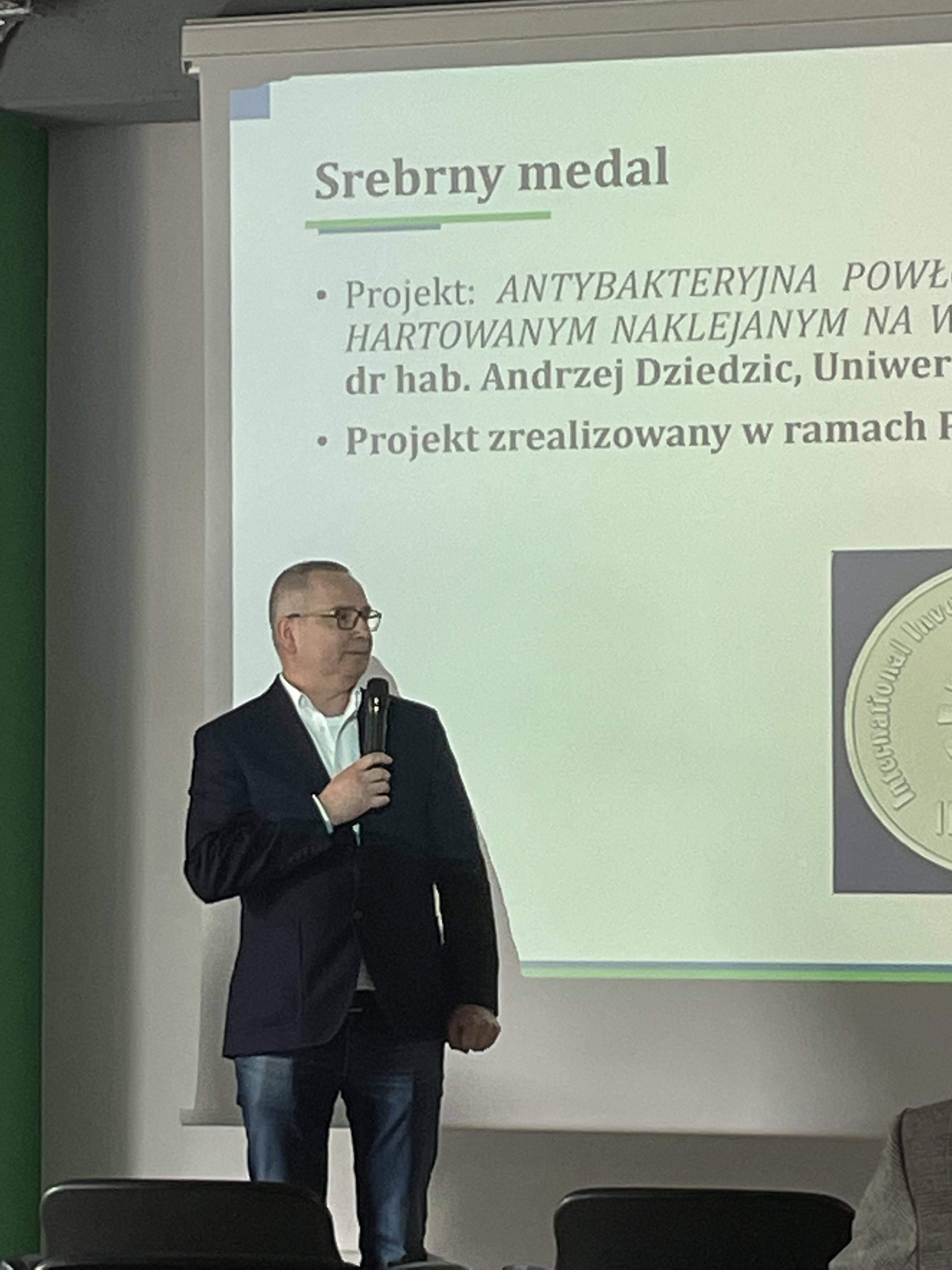 • Antybakteryjna Powłoka TiO2:Ag, N Wytworzona na Szkle Hartowanym Naklejanym na Wyświetlacze Dotykowe opracowany przez zespół naukowy z Kolegium Nauk Przyrodniczych i Kolegium Nauk Medycznych: dr hab. Andrzej Dziedzic, prof. UR, dr Stanisław Adamiak, dr hab. inż. Anna Żaczek, prof. UR, dr hab. Andrzej Wal, prof. UR, mgr inż. Bartosz Zdeb