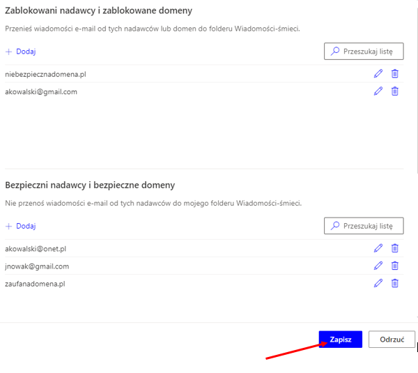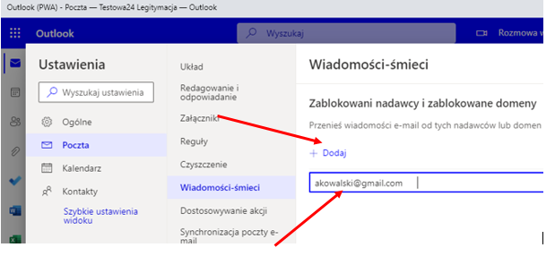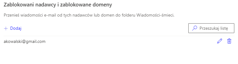 Przechodzimy do sekcji Zablokowani nadawcy i zablokowane domeny, gdzie możemy dodawać adresy e-mail i/lub domeny, które Outlook będzie traktował jako niezaufane – wiadomości przysłane od takich nadawców lub od wszystkich nadawców z niezaufanej domeny będą kierowane do folderu „Wiadomości-śmieci”.