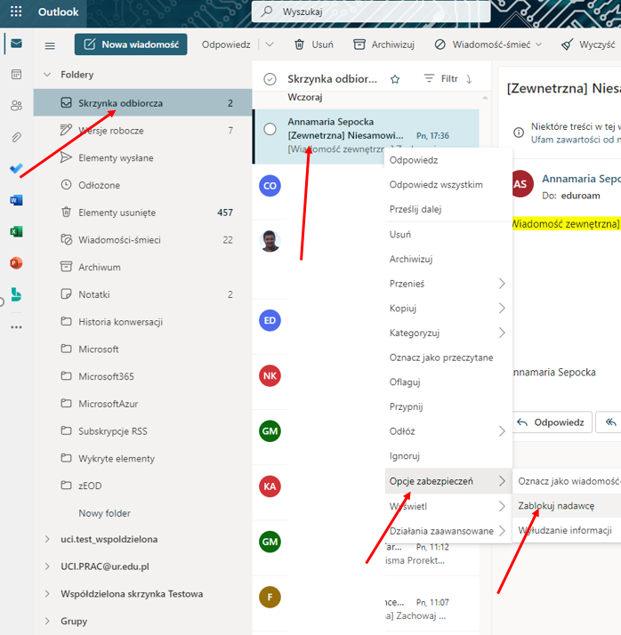 Drugi sposób – kiedy niechciana wiadomość jest już w folderze „Skrzynka odbiorcza”: