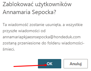 Na ekranie pojawi się okno z informacją, że dana wiadomość zostanie usunięta a adres nadawcy trafi na listę zablokowanych nadawców i wszystkie przyszłe maile, które będą od niego przychodziły będą kierowane do folderu „Wiadomości-śmieci”. Jeżeli zgadzamy się z tym zatwierdzamy wybór klikając przycisk OK.