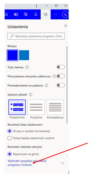 Na dole okna, które się pojawi wybieramy opcję – Wyświetl wszystkie ustawienia programu Outlook.